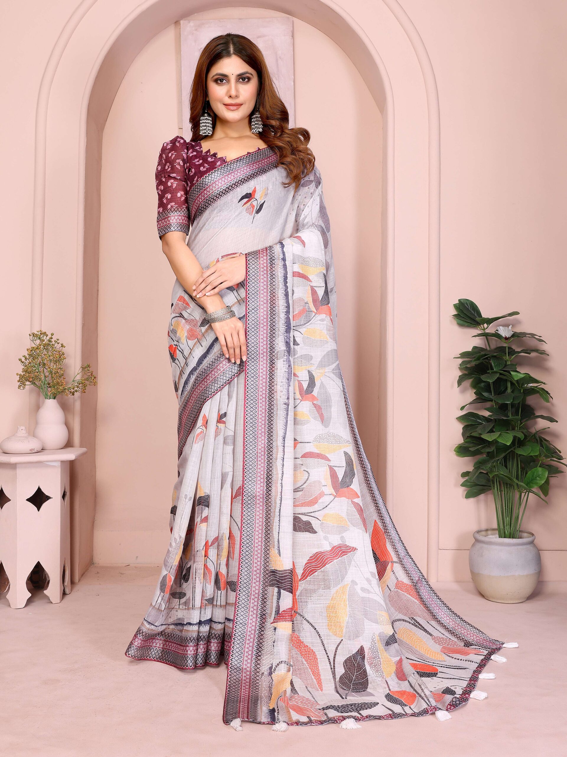 Elegant Linen Cotton Saree ? Soft Grey with Multicolor Autumn Leaf Print & Wine-Geometric Border