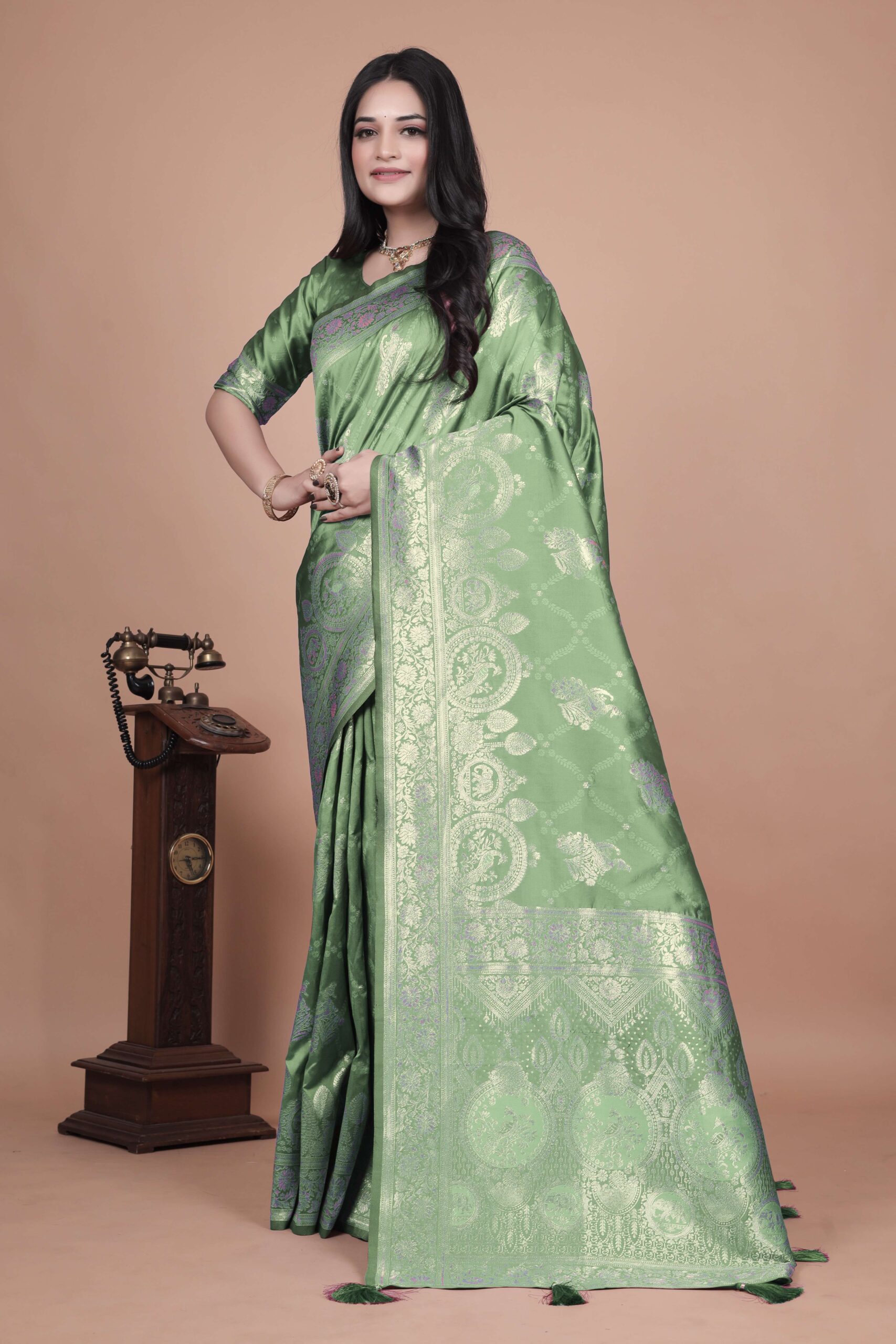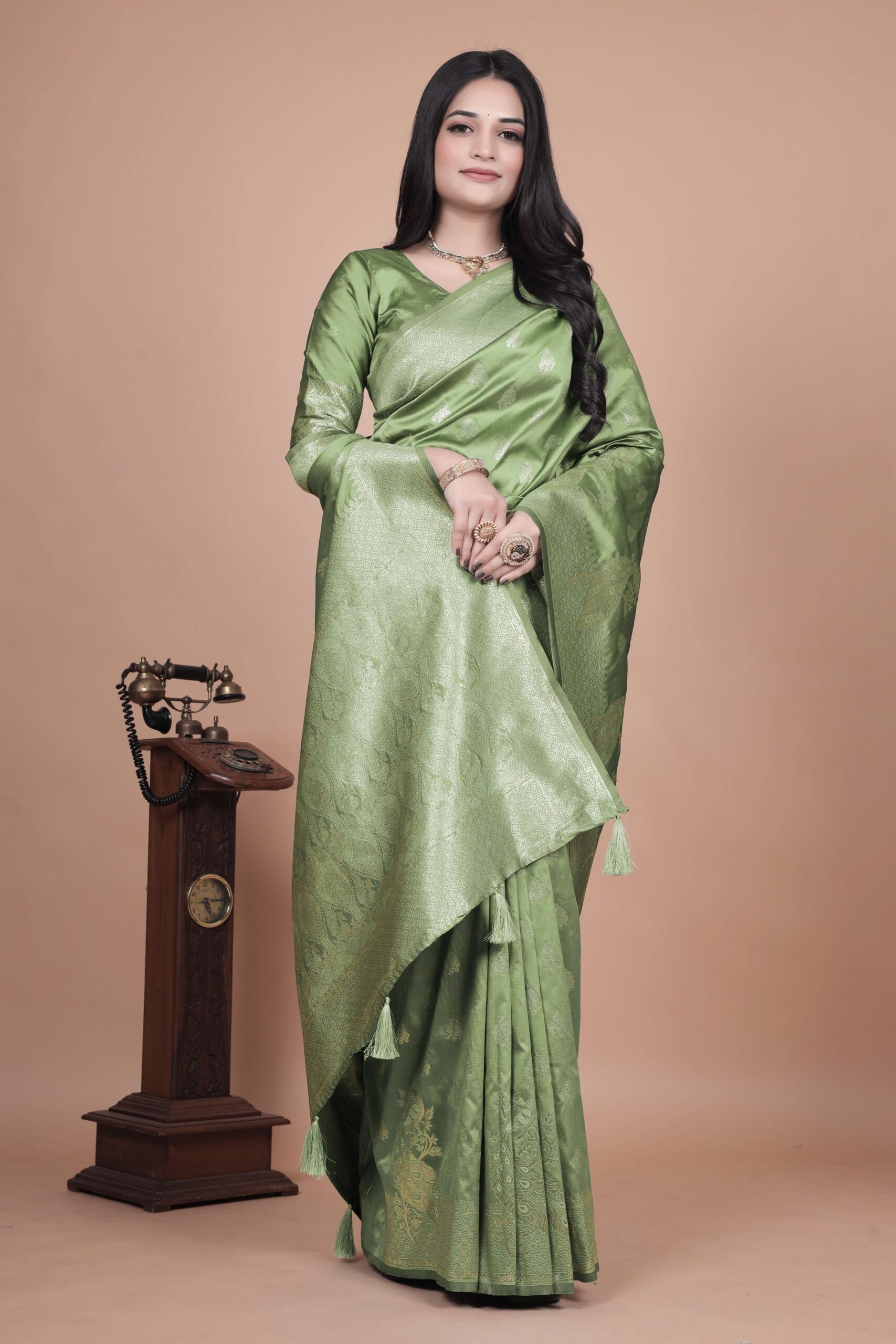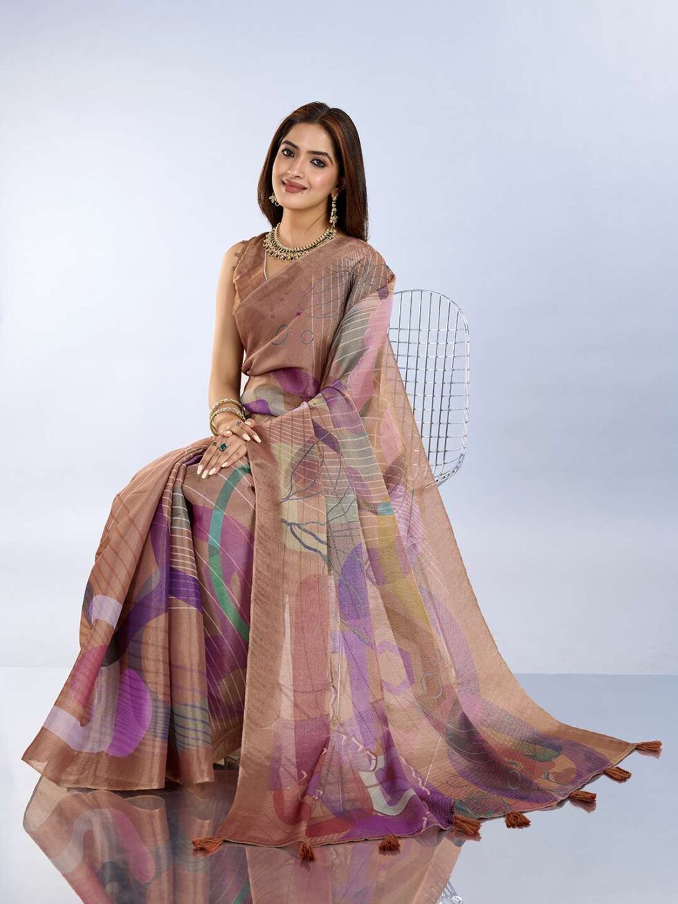 This unique linen shimmer saree in a warm earthy tone features a captivating abstract print in soft pastels. The blend of modern art and a traditional silhouette makes it a stylish and elegant choice for any special occasion.