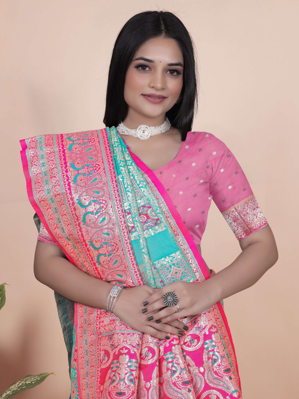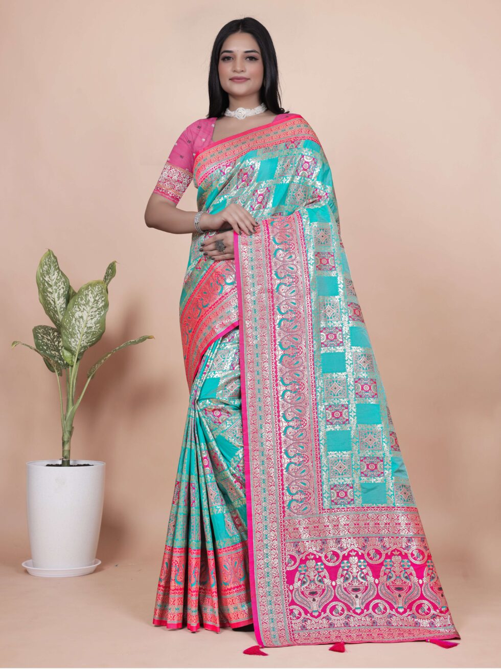 Drape elegance with this aqua blue and pink Banarasi silk saree, featuring silver zari motifs, a rich paisley-floral pallu, and ornate contrast border. Perfect for weddings, parties, and festive occasions, comes with matching blouse piece.