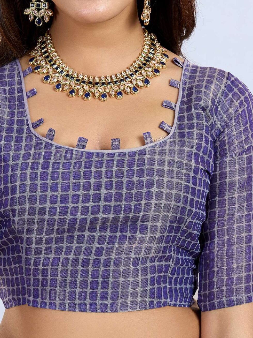 Wrap yourself in the creative elegance of this Artistic Lavender Saree with Geometric and Floral Prints. This beautiful saree is crafted from a lightweight fabric with a refined sheen, giving it a graceful drape. The body of the saree has a striped, woven pattern in a soft lavender hue, while the pallu is adorned with subtle floral and abstract designs in a complementary palette. The striking element is the border, which features a bold geometric pattern, creating a modern and artistic contrast.