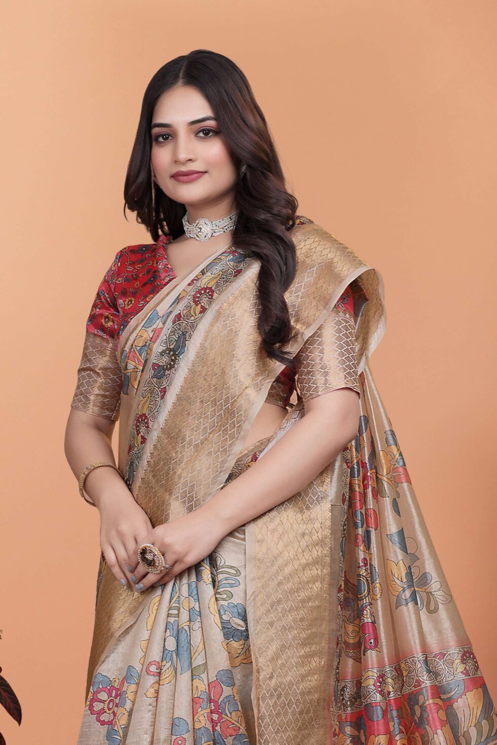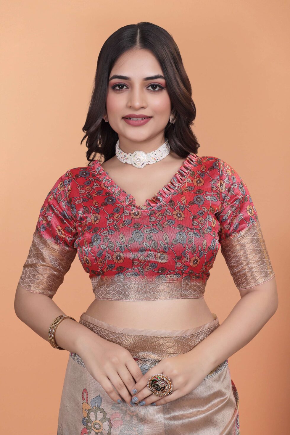 This elegant soft silk saree in a subtle beige hue is adorned with intricate multicolor Patola-inspired floral and paisley motifs. The pallu features a vibrant design with exquisite craftsmanship, adding grandeur to the overall look. The red blouse with woven detailing provides a perfect contrast, enhancing its festive appeal.