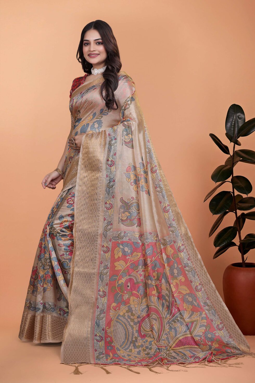 Perfect for festive occasions and traditional gatherings, this saree beautifully blends heritage art with modern grace, making it a timeless piece for your wardrobe.