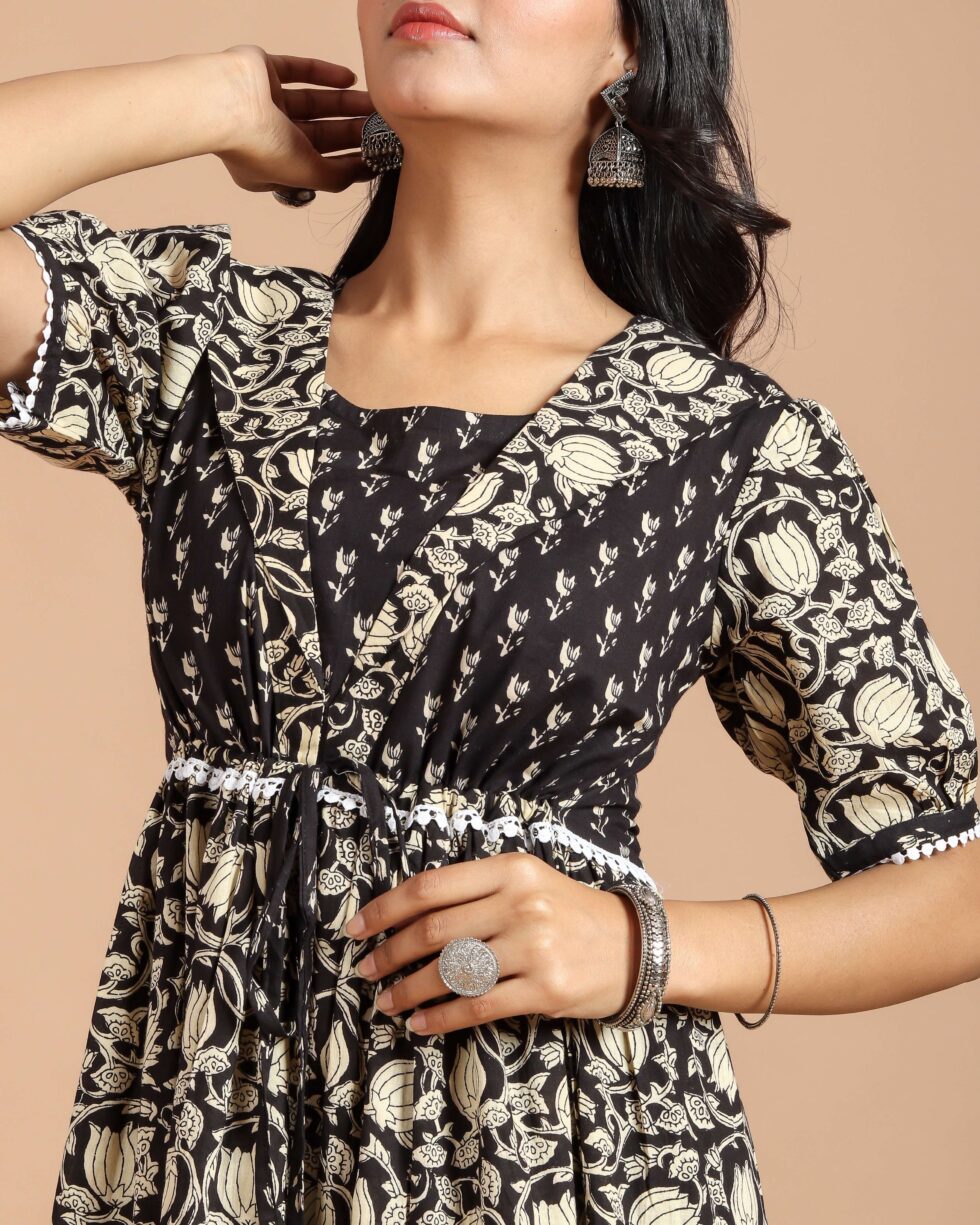 Effortless elegance with our Floral Printed A-Line Midi Dress, designed to keep you stylish and comfortable all day long. Crafted from premium breathable fabric, this dress features a timeless A-line silhouette that flatters every body type. The vibrant floral print on a classic black base adds a touch of charm, making it perfect for both daytime outings and evening gatherings.