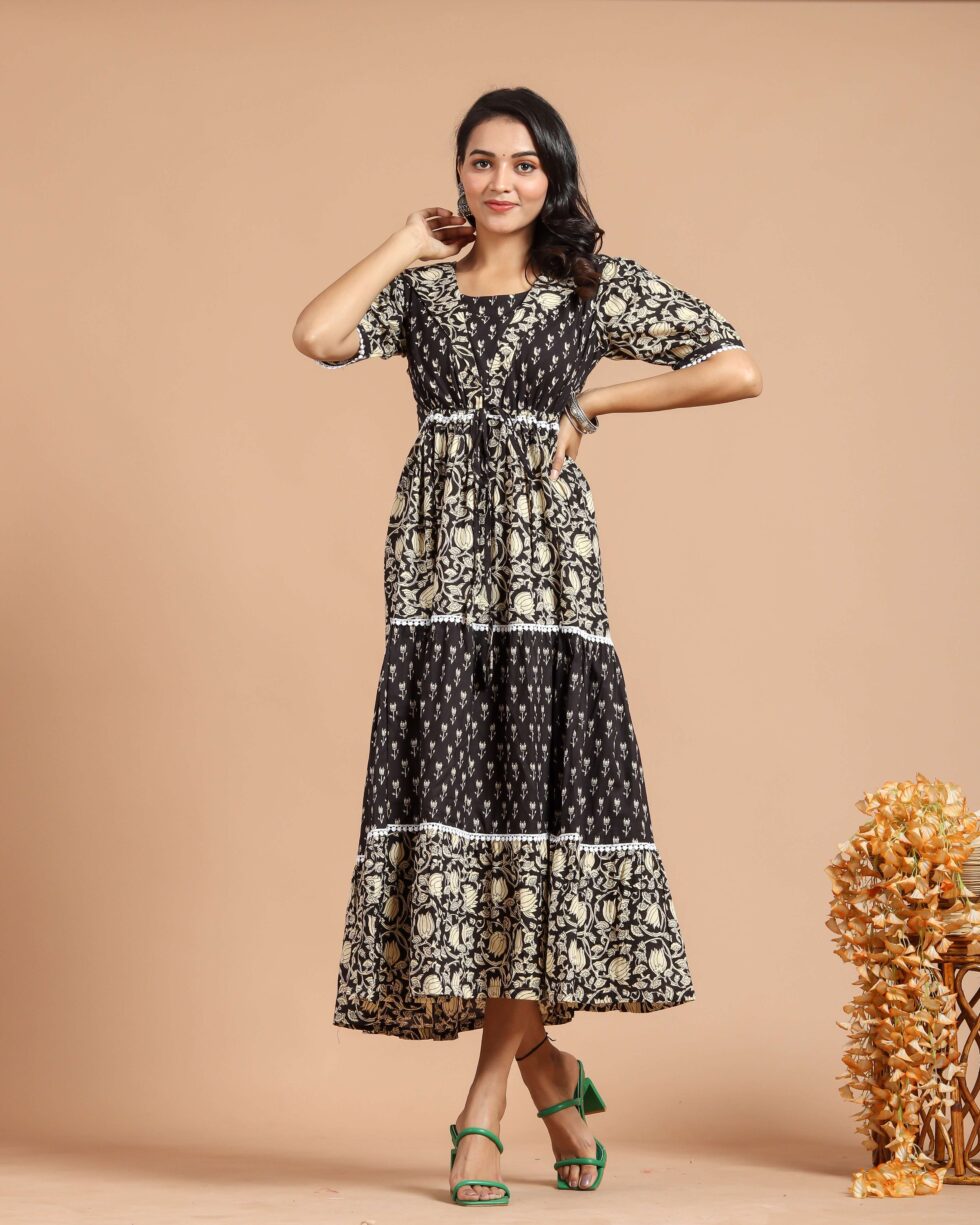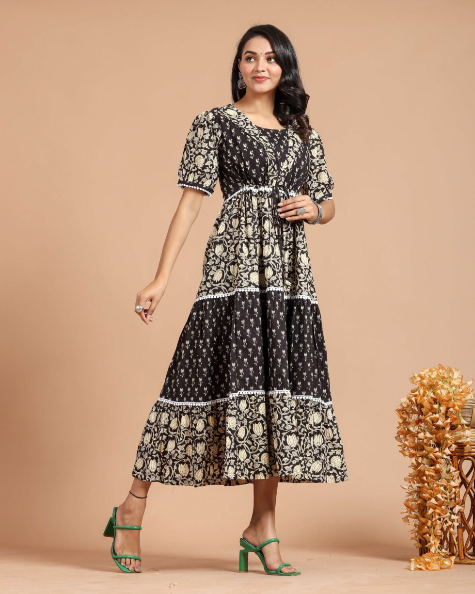 Black & Beige Printed Tiered Maxi Dress with Short Sleeves & Waist Tie ? Ethnic Boho Fusion Wear