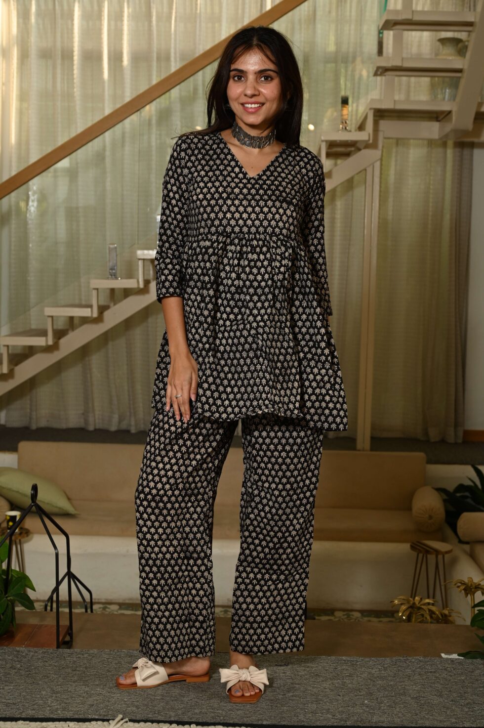 Black Block Print Cotton Co-ord Set for Women ? Peplum Kurta & Straight Pants
