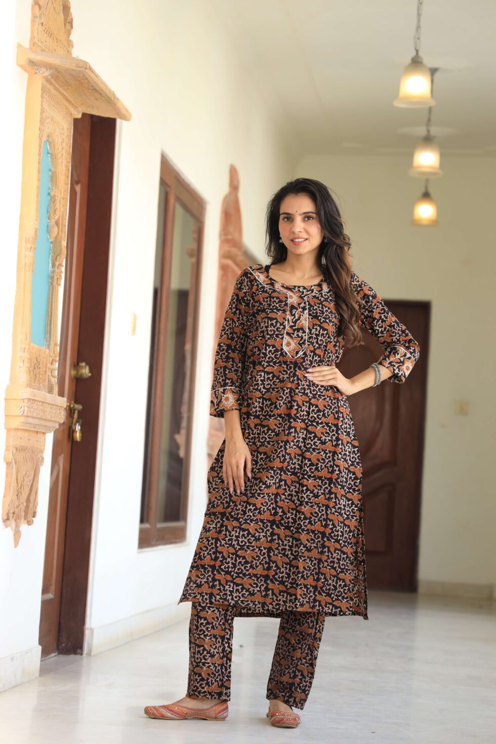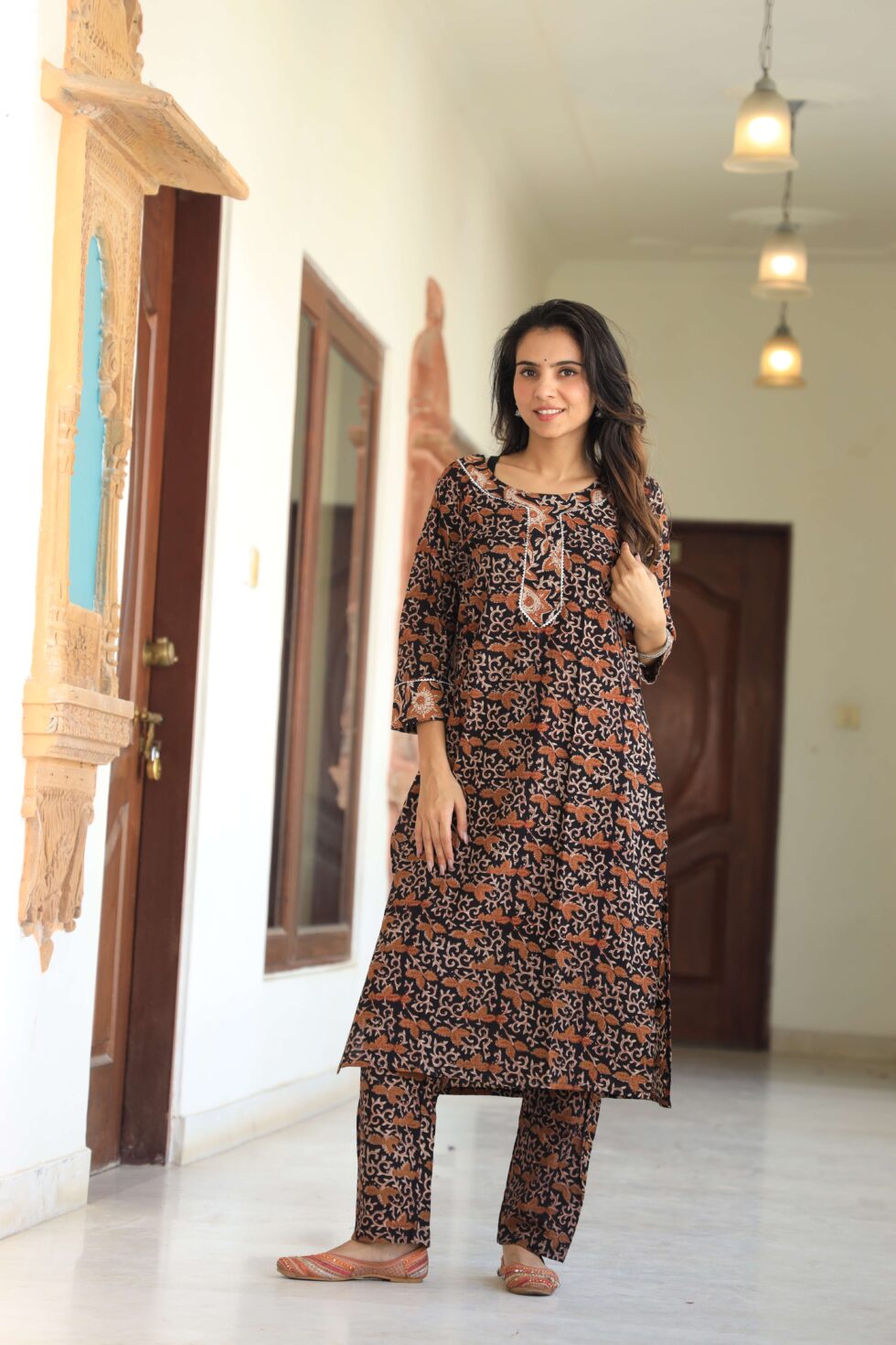 black and brown printed cotton kurta set, blending traditional charm with contemporary elegance. The kurta comes with delicate embroidery around the neckline and sleeves, highlighting the earthy tones beautifully. and leafy motifs in shades of brown and beige, creating a timeless appeal. The straight-cut pants complete the set for a coordinated and comfortable look.