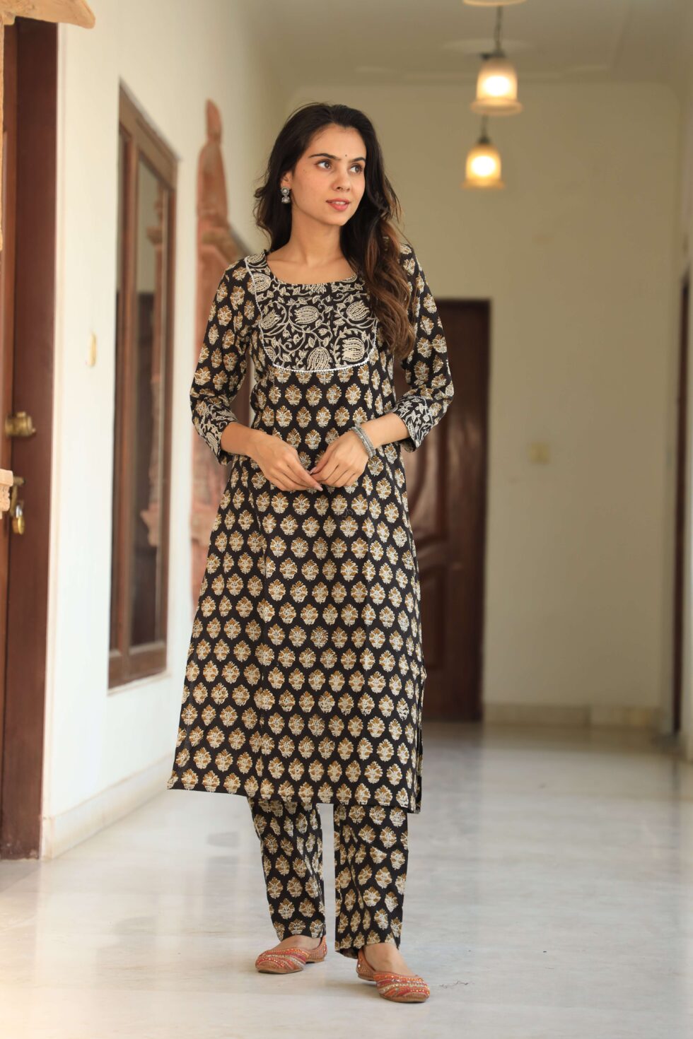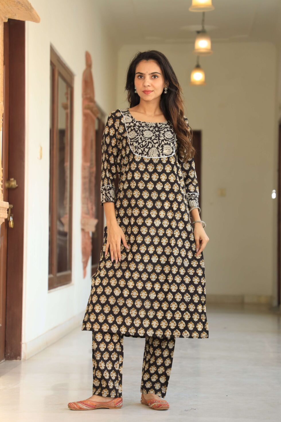 Stylish black cotton kurta set featuring earthy brown prints, embroidered neckline, and straight pants. Perfect for office wear, casual outings, and festive gatherings.