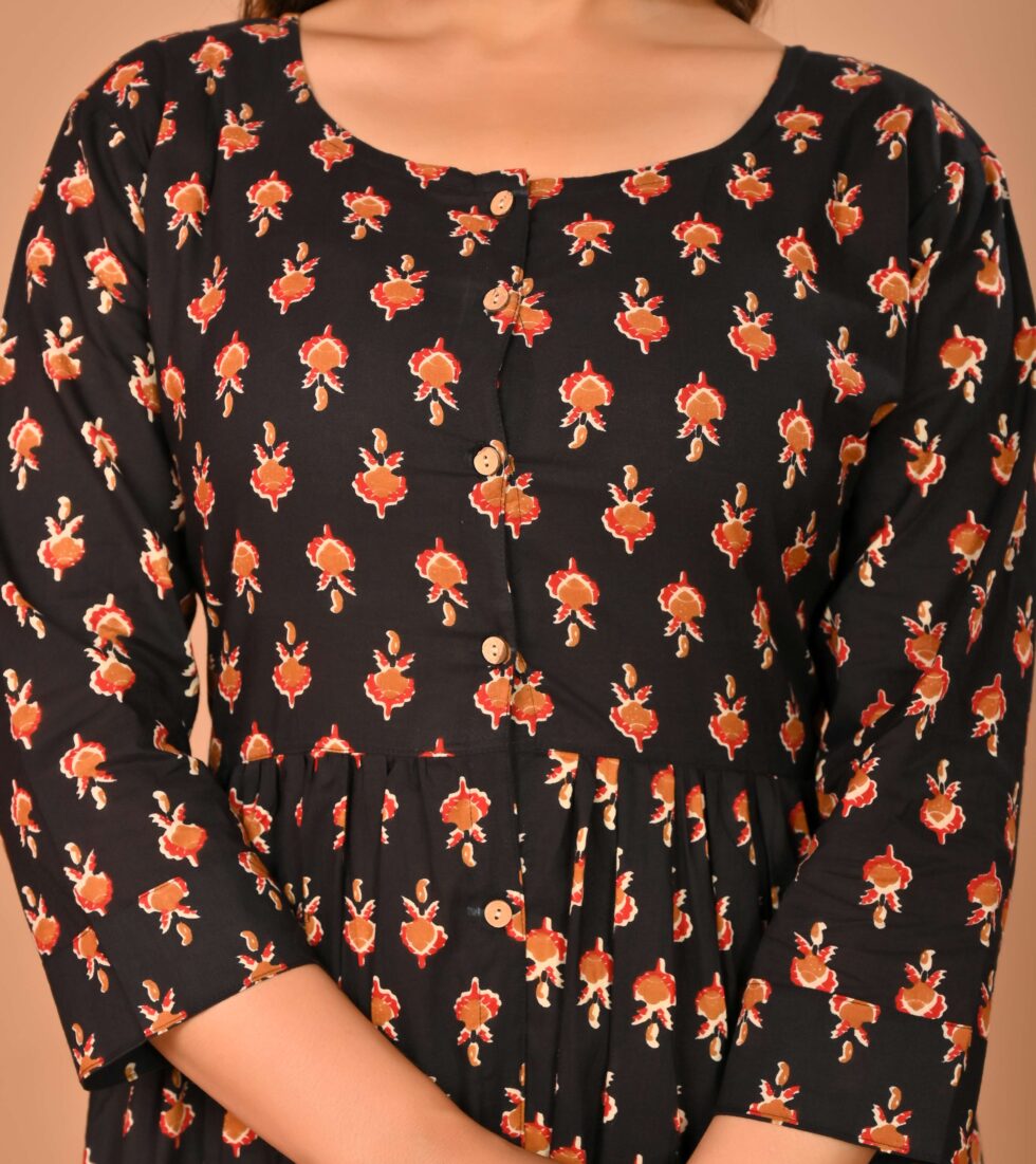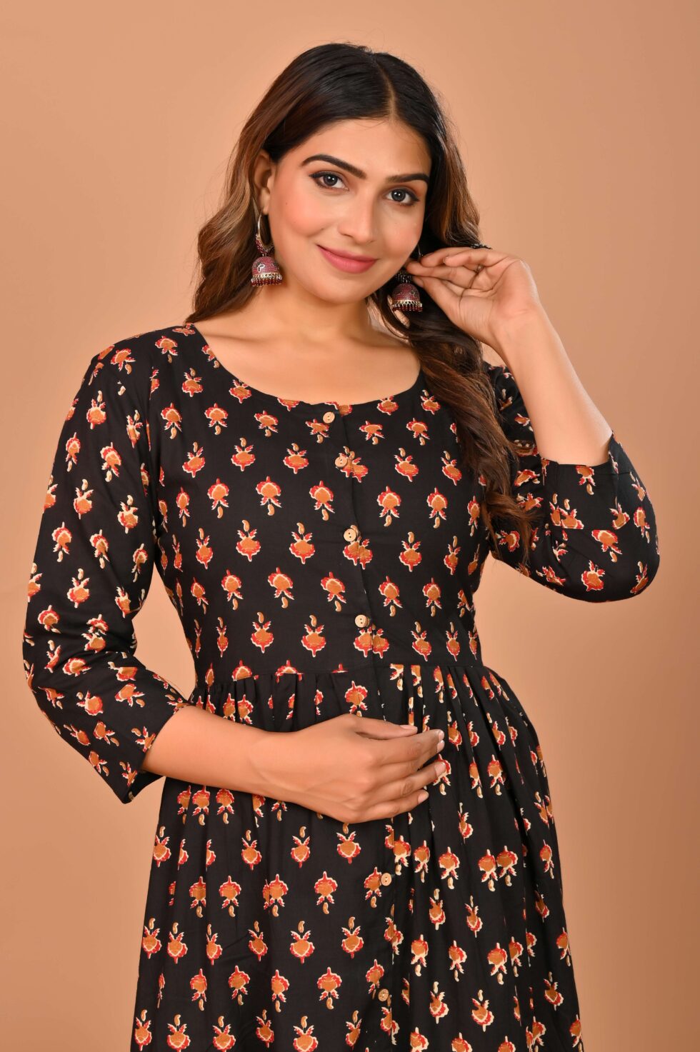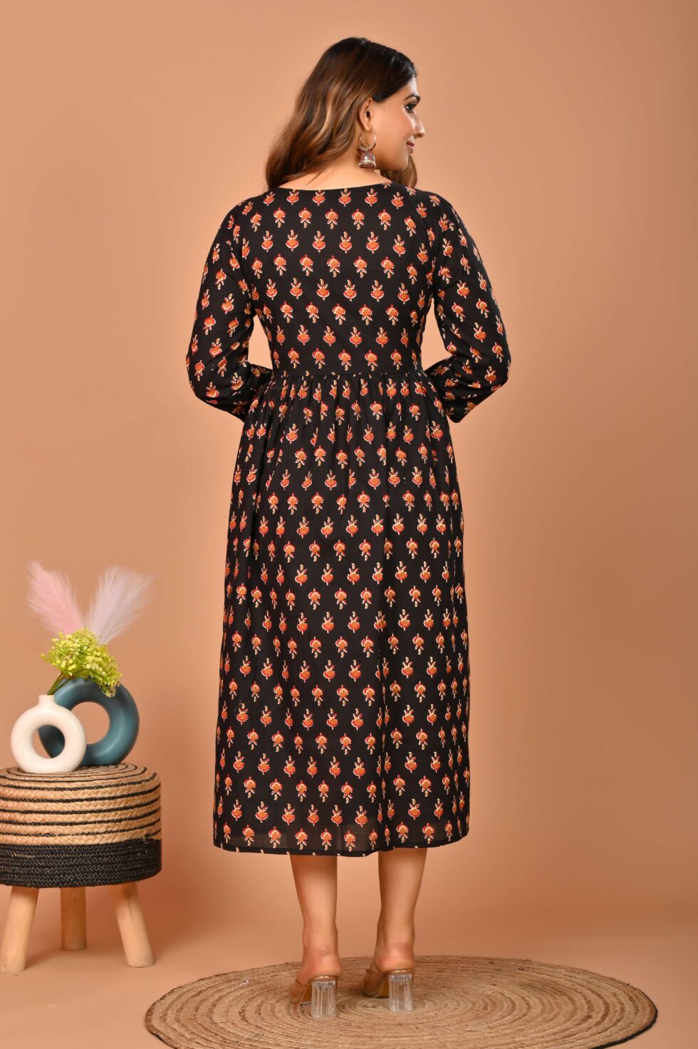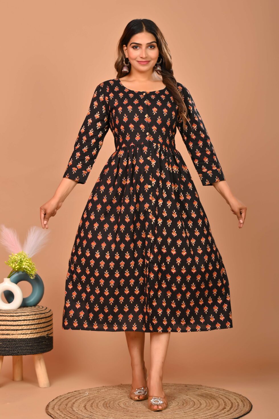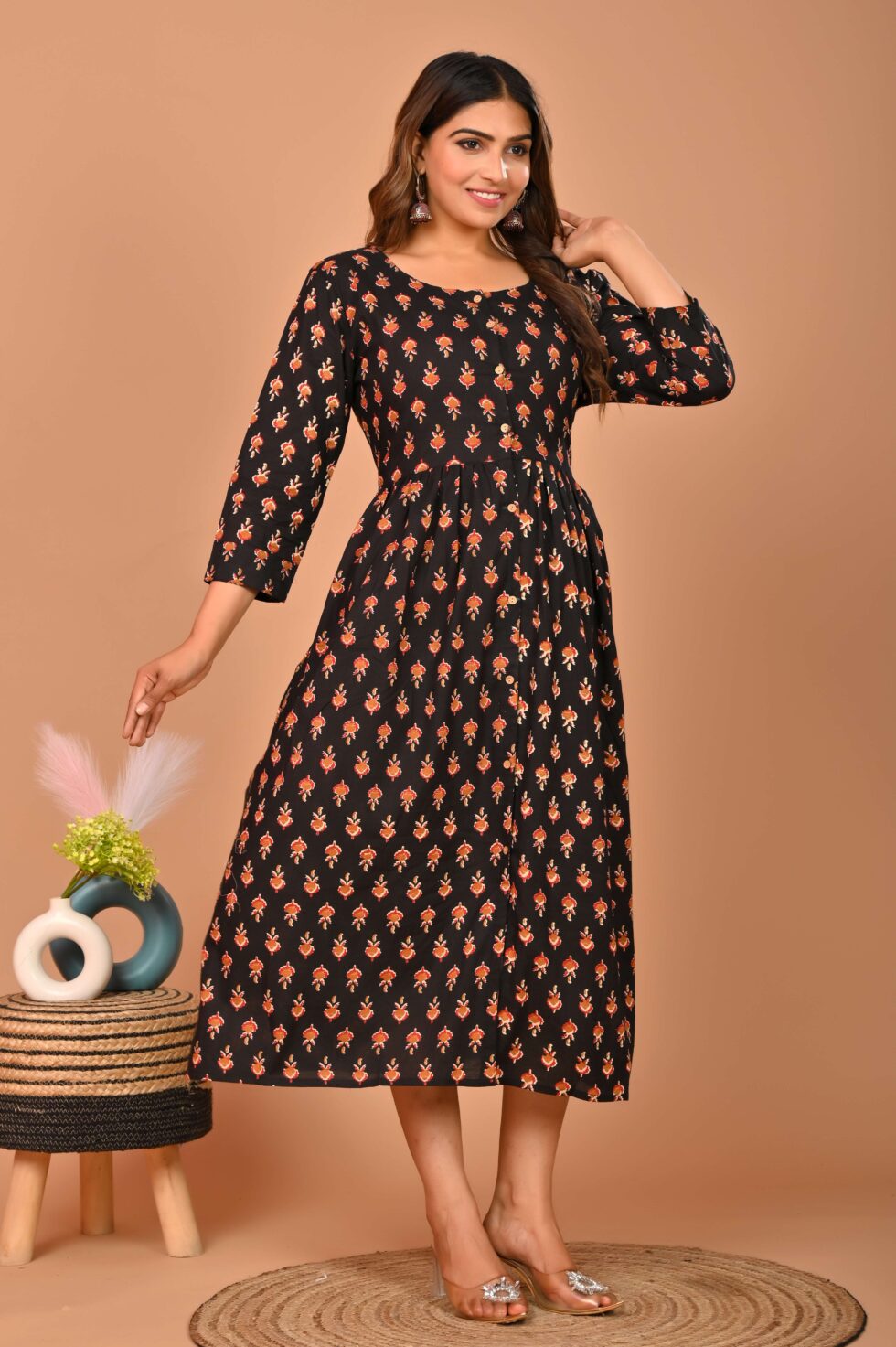 Be the first to review “Black Floral Printed A-Line Midi Dress with 3/4th Sleeves ? Elegant Casual & Party Wear”