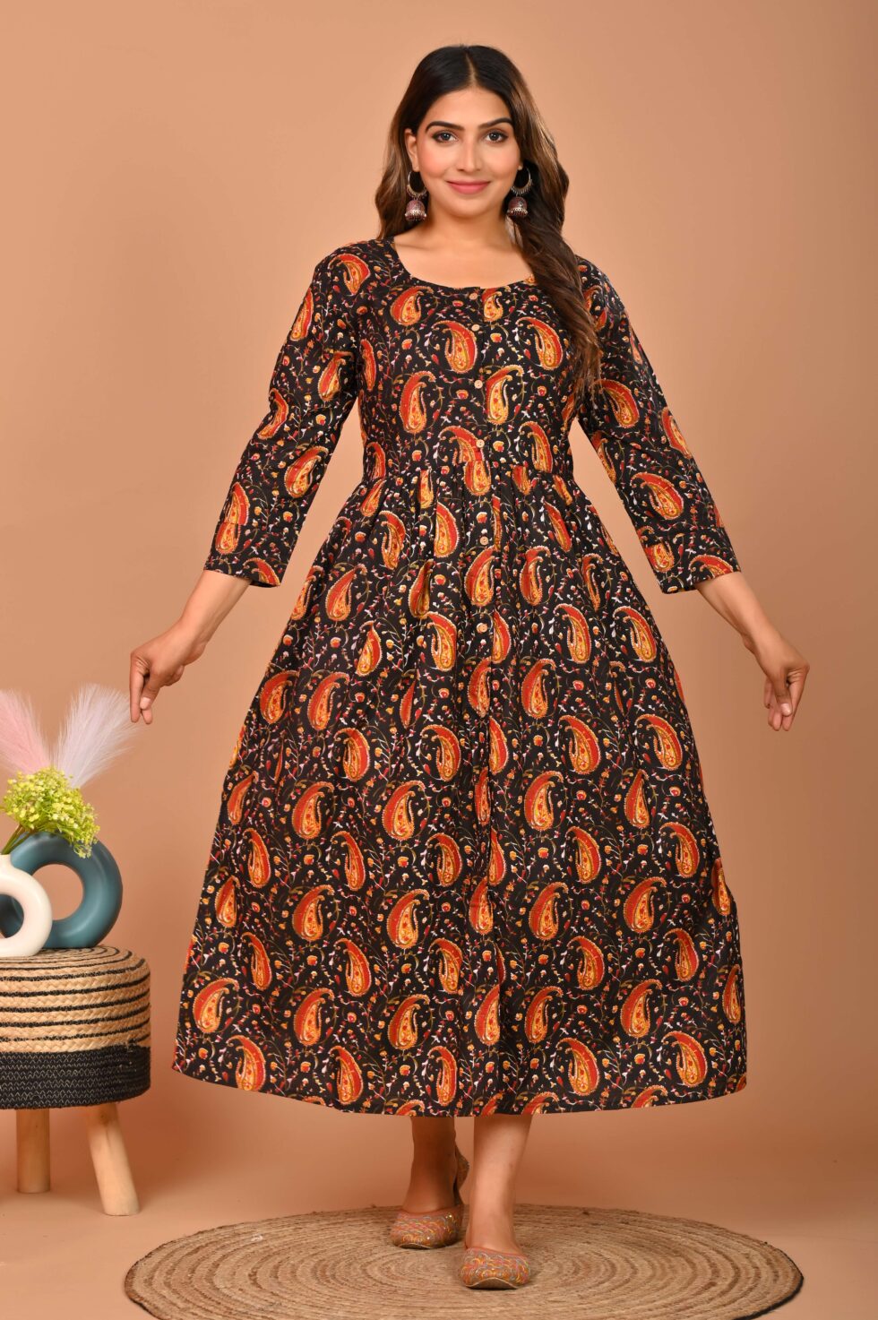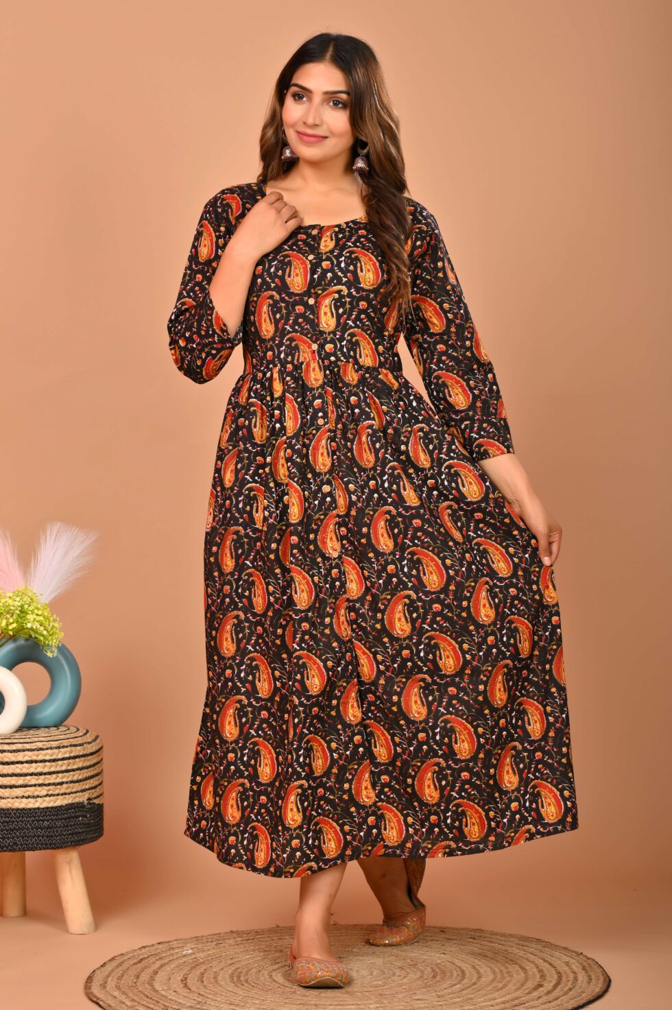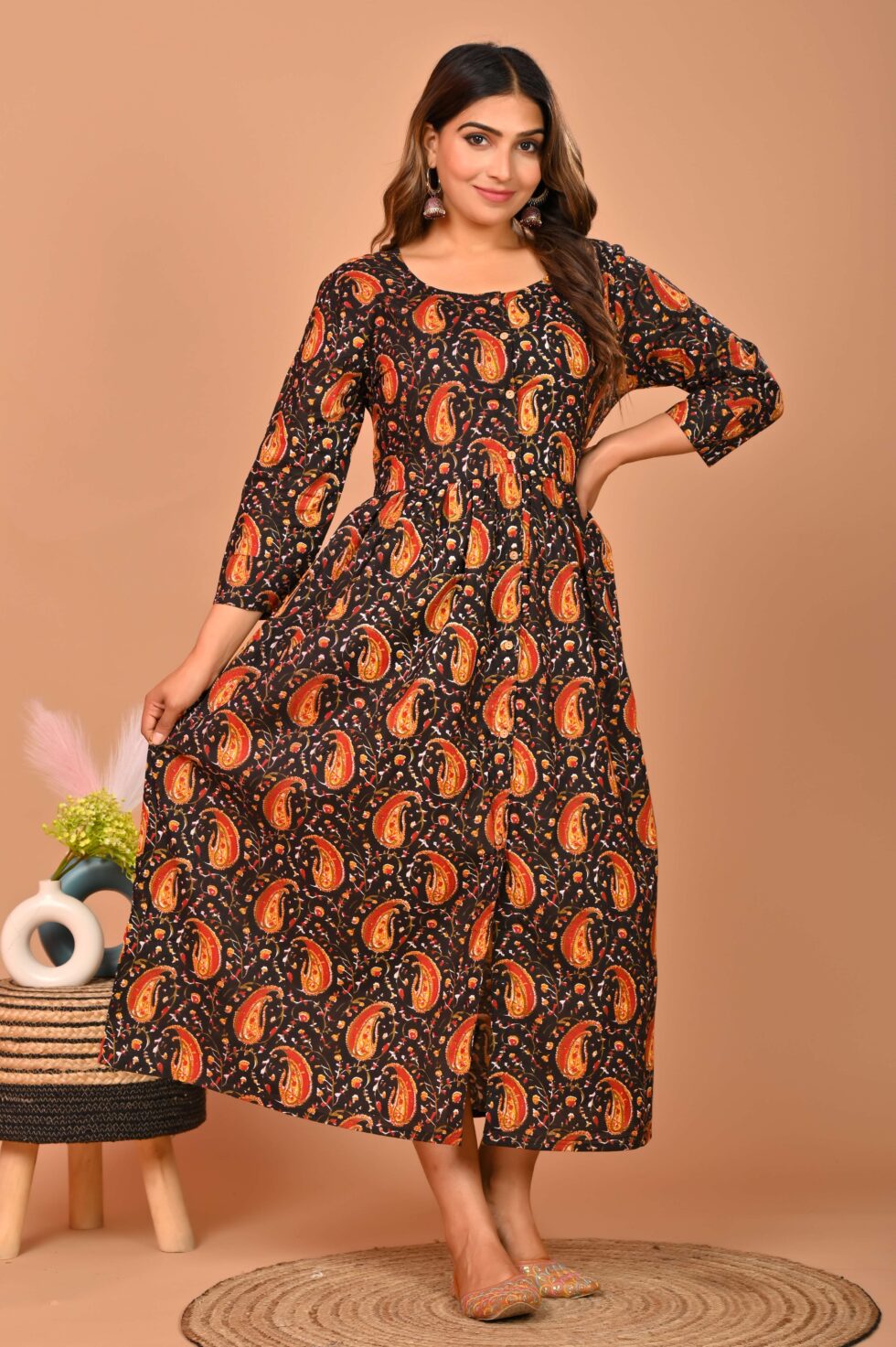 Effortless elegance with our Floral Printed A-Line Midi Dress, designed to keep you stylish and comfortable all day long. Crafted from premium breathable fabric, this dress features a timeless A-line silhouette that flatters every body type. The vibrant floral print on a classic black base adds a touch of charm, making it perfect for both daytime outings and evening gatherings.