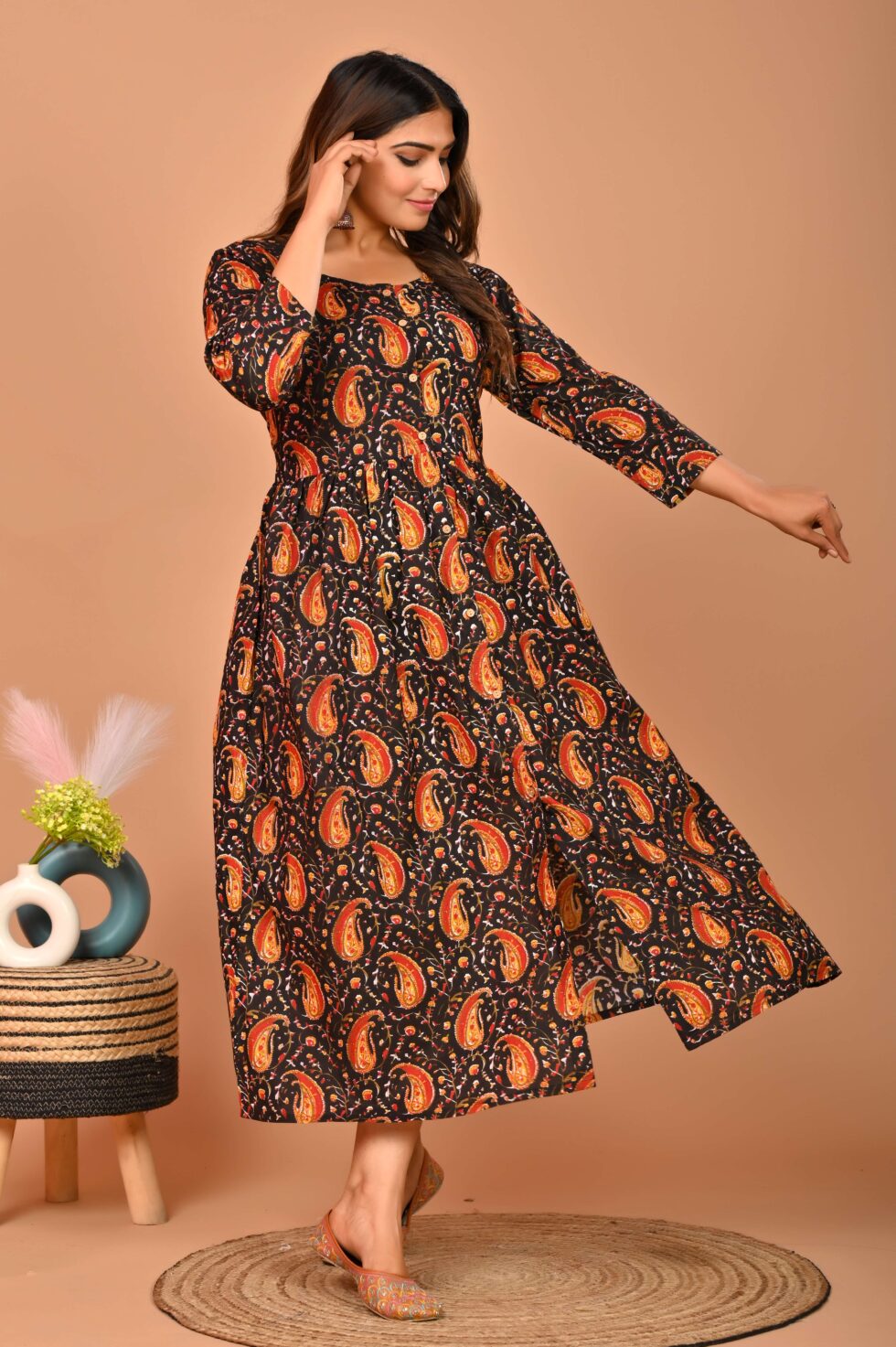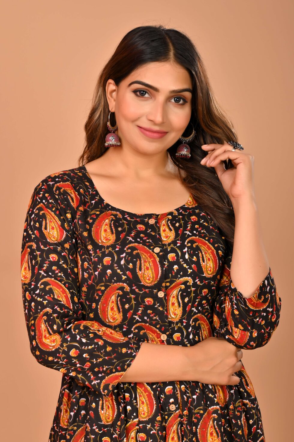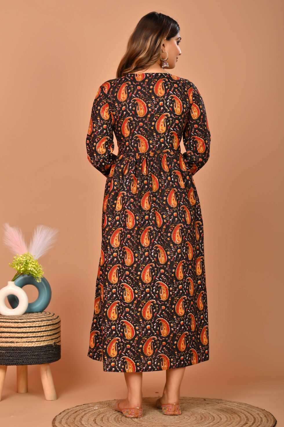 Effortless elegance with our Floral Printed A-Line Midi Dress, designed to keep you stylish and comfortable all day long. Crafted from premium breathable fabric, this dress features a timeless A-line silhouette that flatters every body type. The vibrant floral print on a classic black base adds a touch of charm, making it perfect for both daytime outings and evening gatherings.