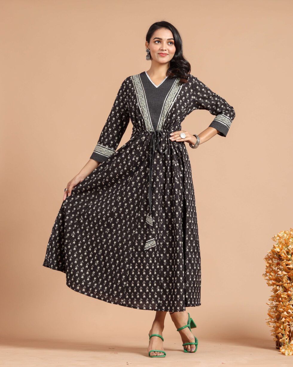 Effortless elegance with our Floral Printed A-Line Midi Dress, designed to keep you stylish and comfortable all day long. Crafted from premium breathable fabric, this dress features a timeless A-line silhouette that flatters every body type. The vibrant floral print on a classic black base adds a touch of charm, making it perfect for both daytime outings and evening gatherings.