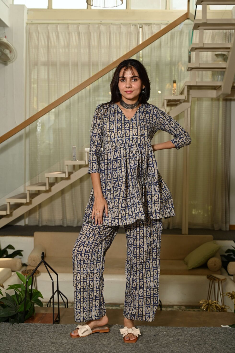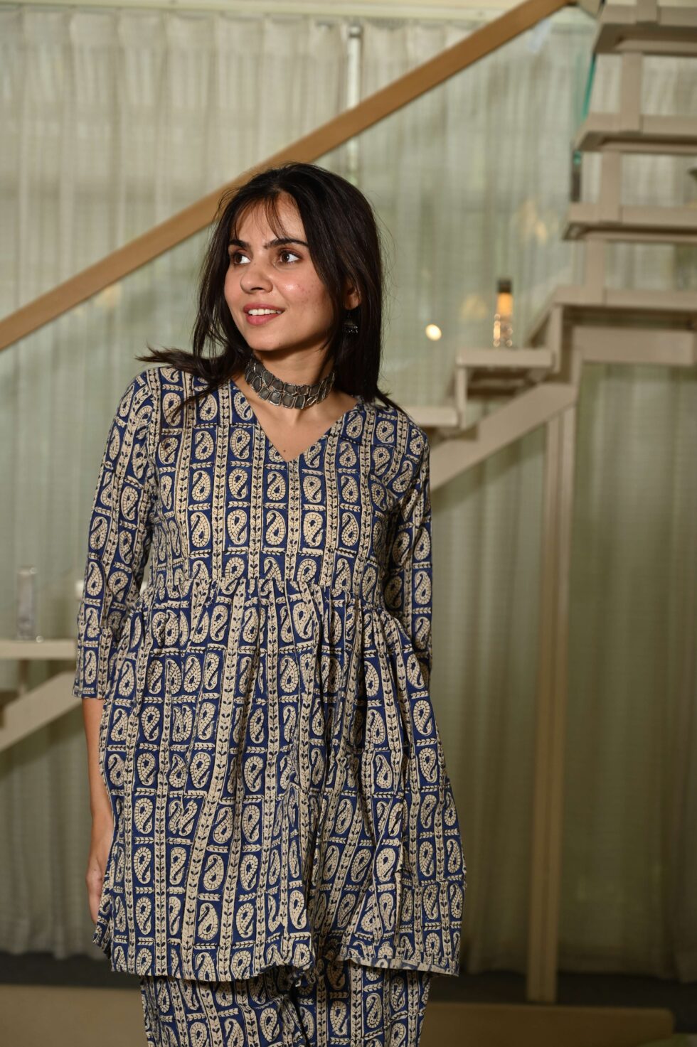 Blue Floral Block Print Cotton Co-ord Set for Women ? Peplum Kurta with Straight Pants