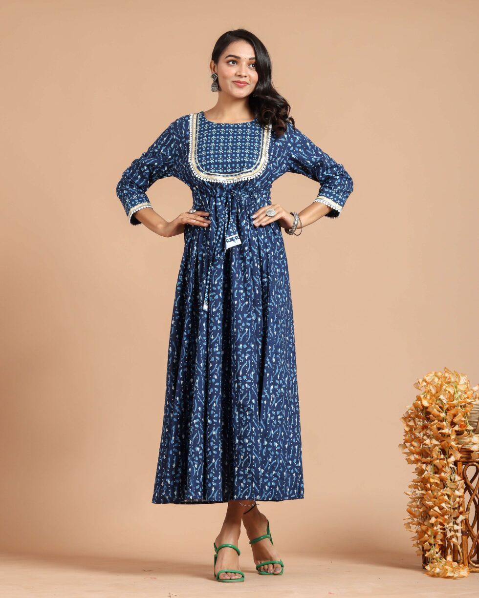 Blue Printed Maxi Dress with Lace Detailing & Waist Tie-Up