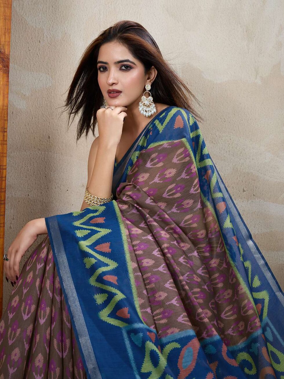 Brown & Blue Ikat Printed Chanderi Saree ? Elegant Traditional & Festive Wear