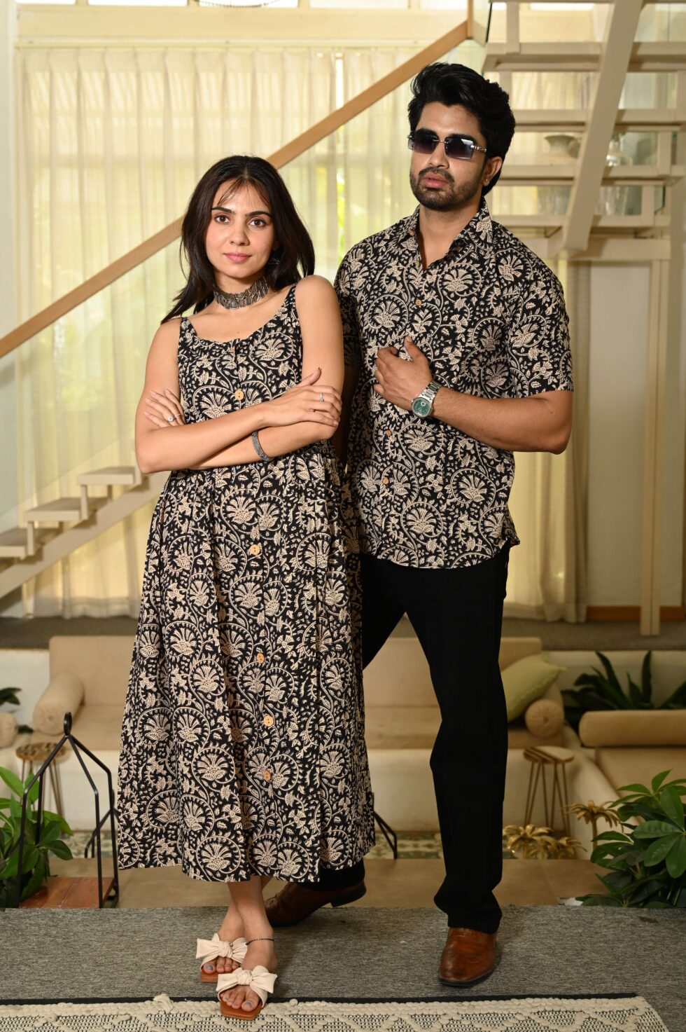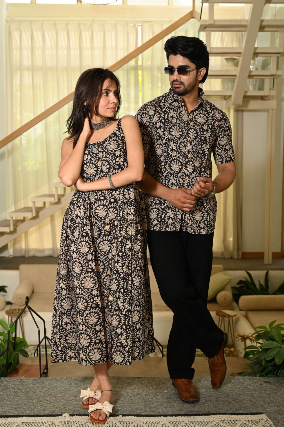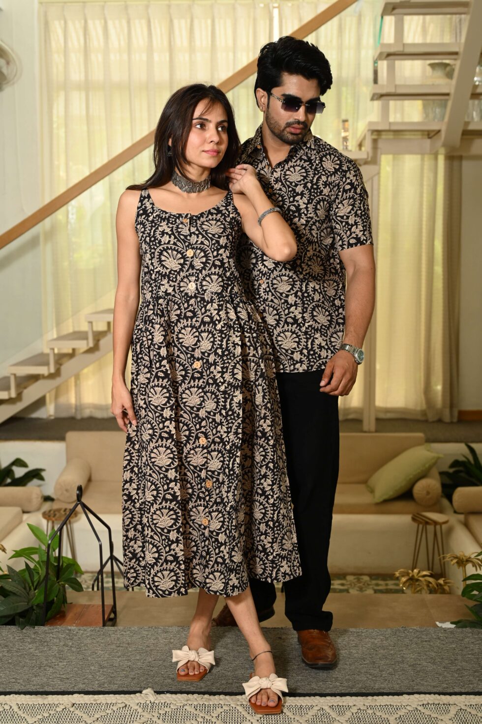 Couple Matching Outfit ? Black & Beige Floral Print Cotton Midi Dress & Shirt Set, Ethnic Casual Wear