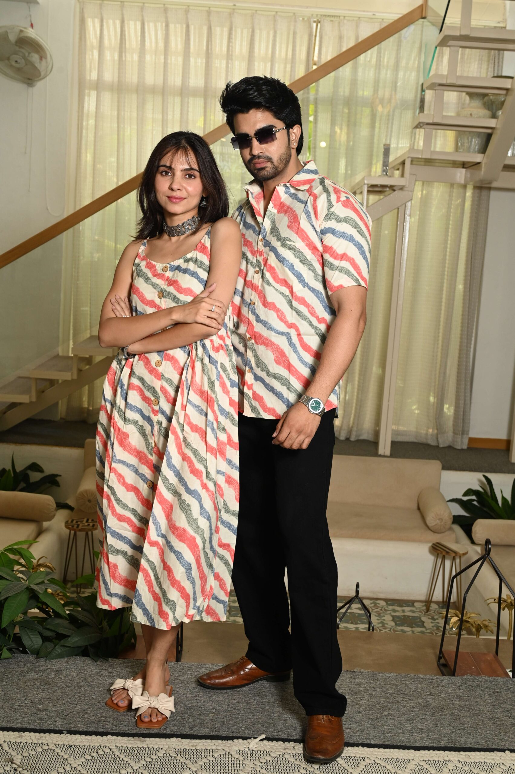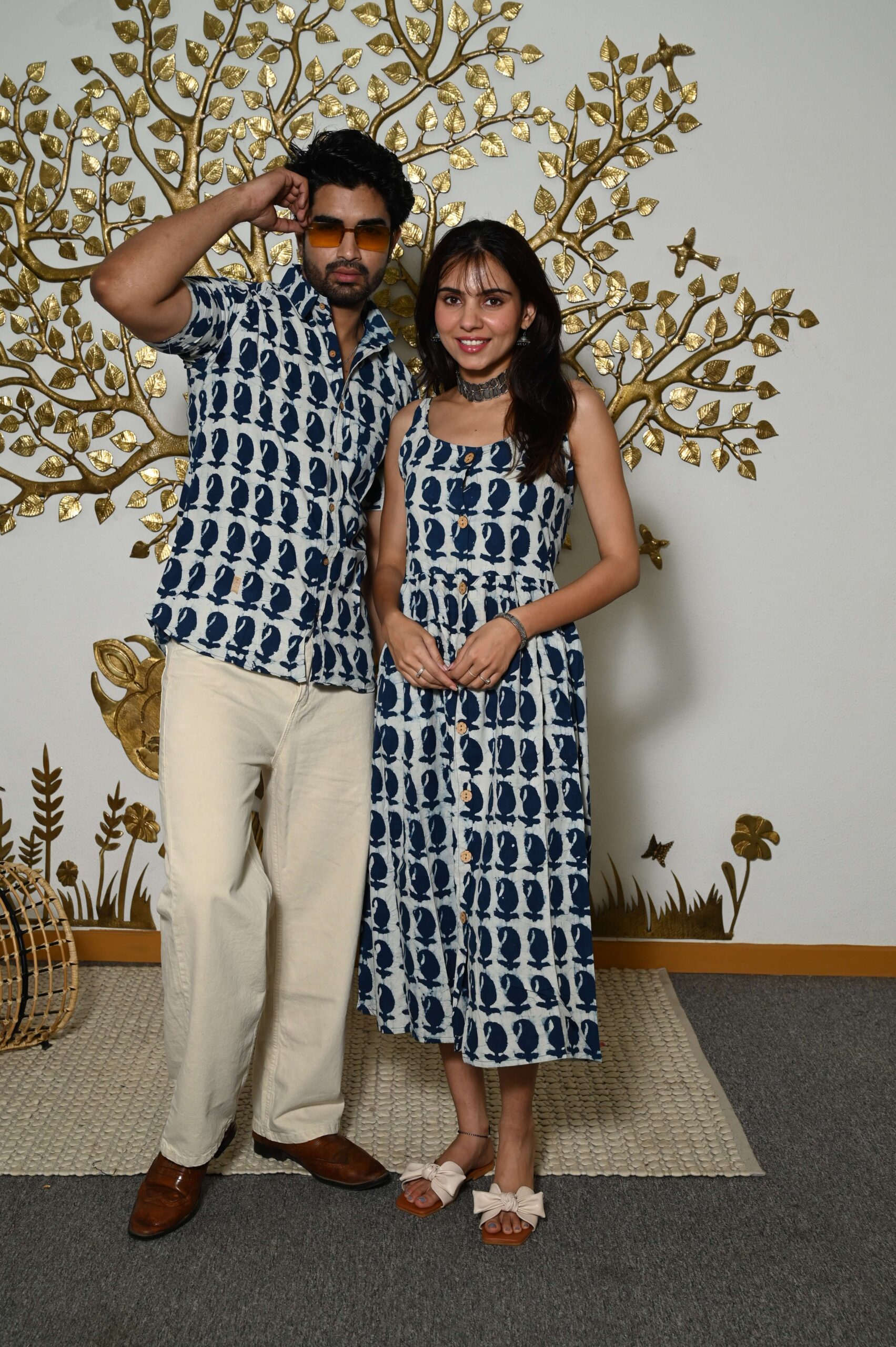 Step out in style with this charming couple matching outfit featuring a printed cotton dress for women and a coordinated short-sleeve shirt for men. Crafted from breathable cotton, this set is perfect for casual outings, vacations, parties, and pre-wedding shoots. The elegant floral-inspired print adds a touch of romance, while the soft fabric ensures all-day comfort. Pair the women?s midi dress with sandals or heels and the men?s shirt with trousers or chinos for a perfectly coordinated couple look.