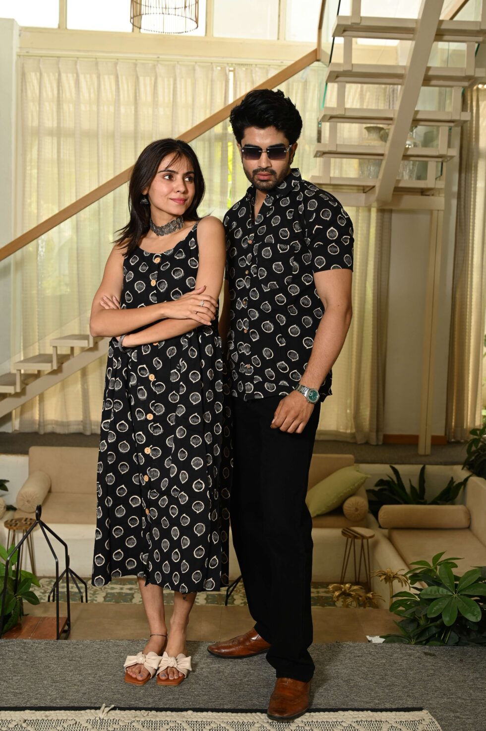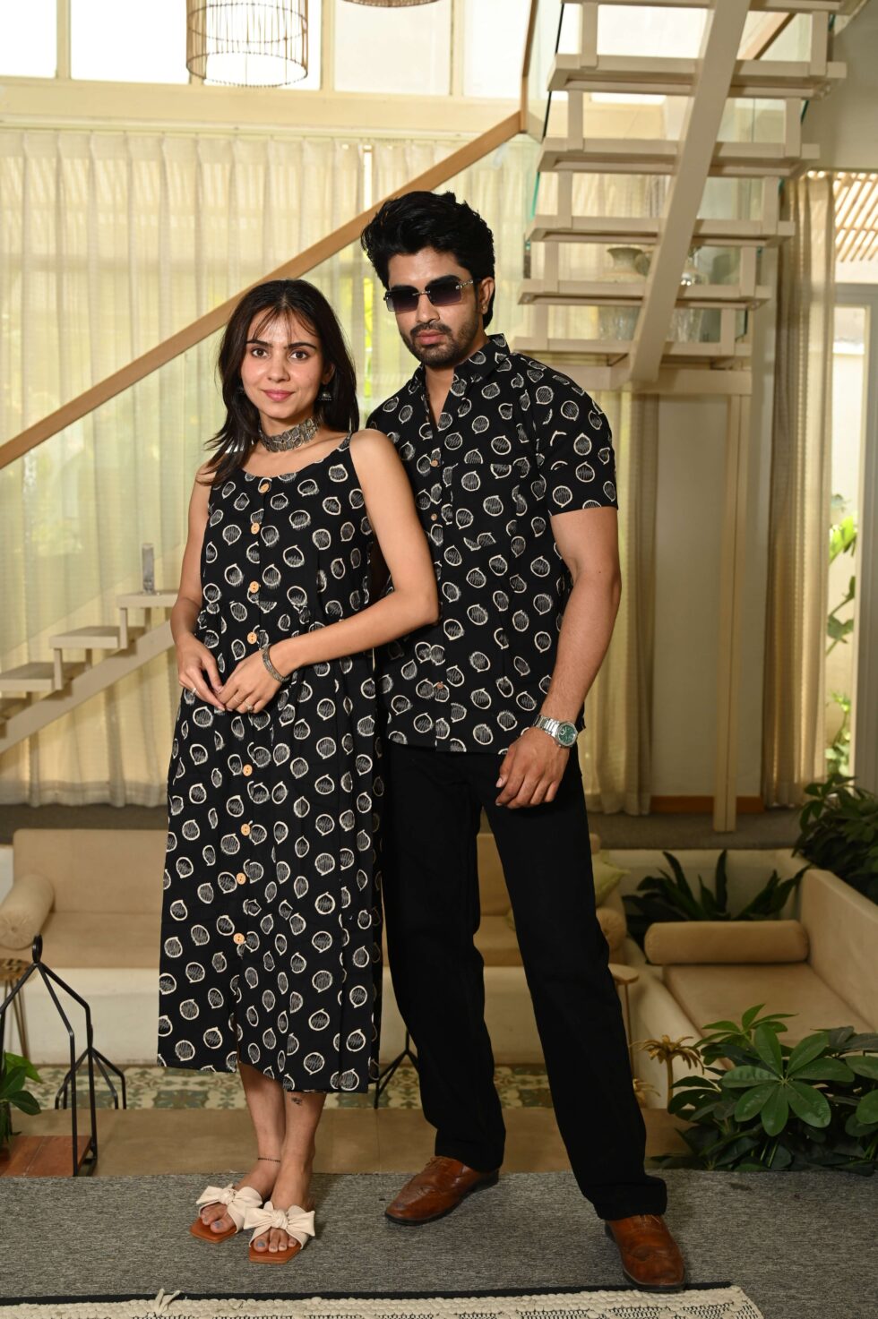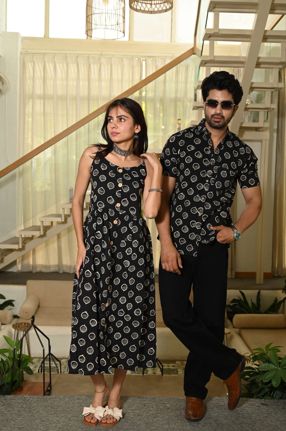 Couple Matching Outfit ? Black Printed Cotton Midi Dress & Shirt Set, Ethnic Casual Wear