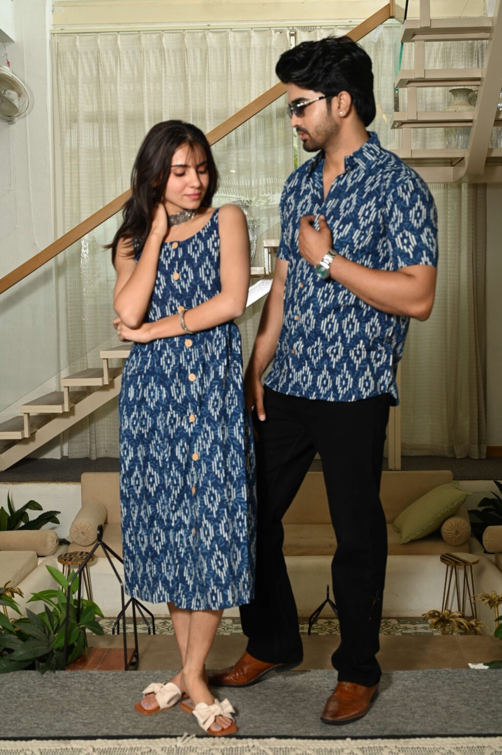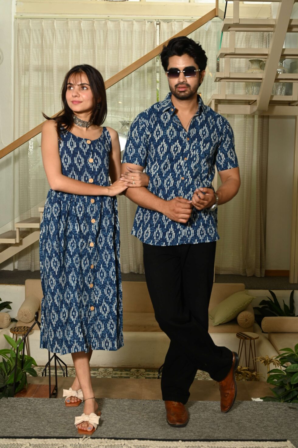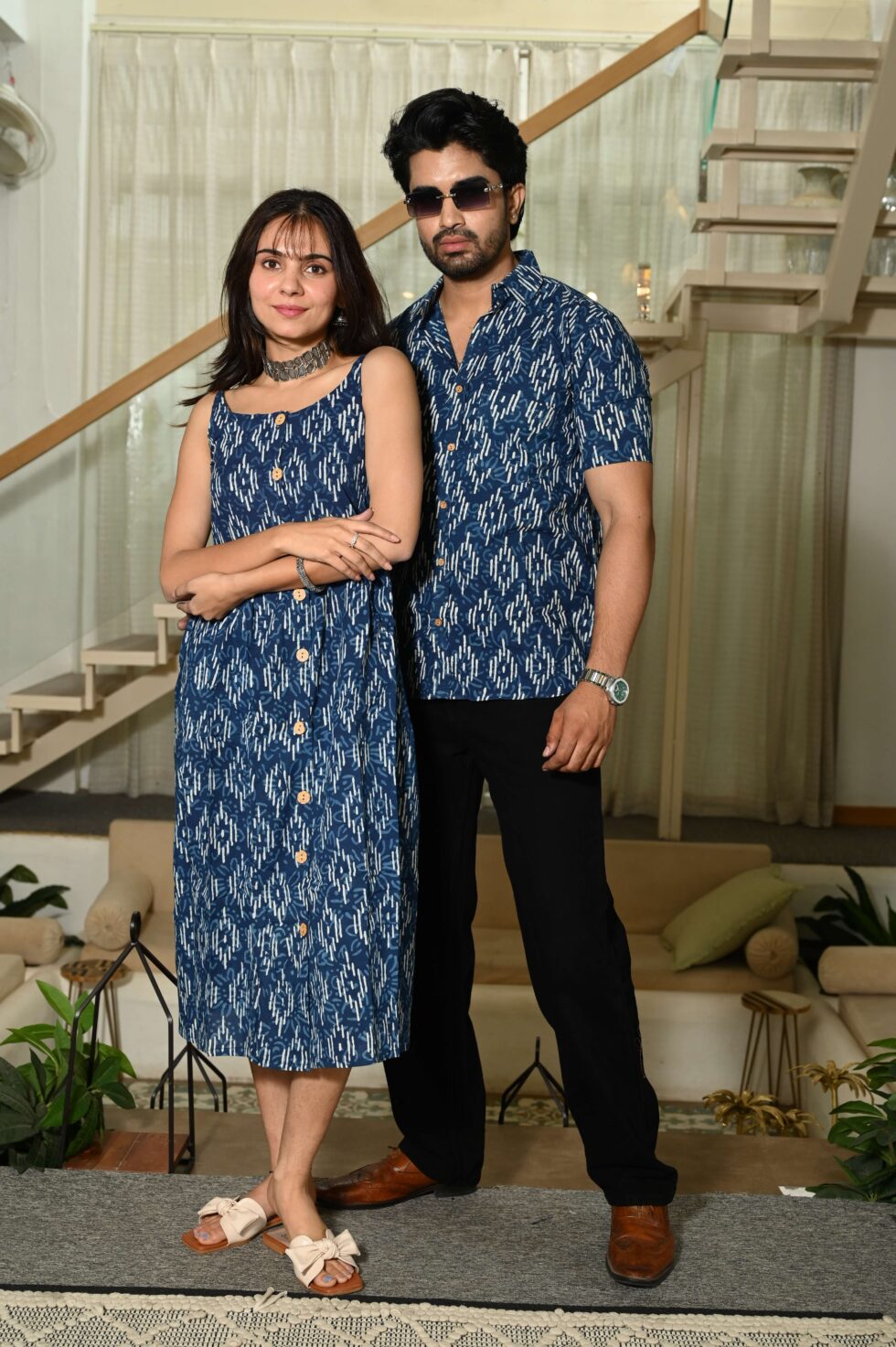 Step out in style with this charming couple matching outfit featuring a printed cotton dress for women and a coordinated short-sleeve shirt for men. Crafted from breathable cotton, this set is perfect for casual outings, vacations, parties, and pre-wedding shoots. The elegant floral-inspired print adds a touch of romance, while the soft fabric ensures all-day comfort. Pair the women?s midi dress with sandals or heels and the men?s shirt with trousers or chinos for a perfectly coordinated couple look.