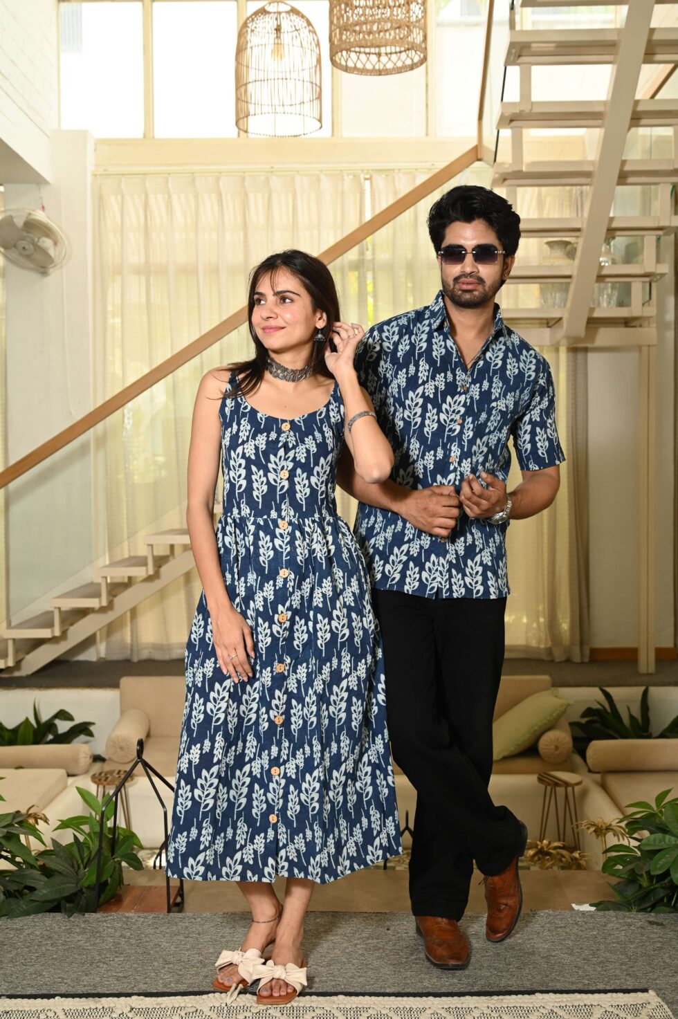 Step out in style with this charming couple matching outfit featuring a printed cotton dress for women and a coordinated short-sleeve shirt for men. Crafted from breathable cotton, this set is perfect for casual outings, vacations, parties, and pre-wedding shoots. The elegant floral-inspired print adds a touch of romance, while the soft fabric ensures all-day comfort. Pair the women?s midi dress with sandals or heels and the men?s shirt with trousers or chinos for a perfectly coordinated couple look.