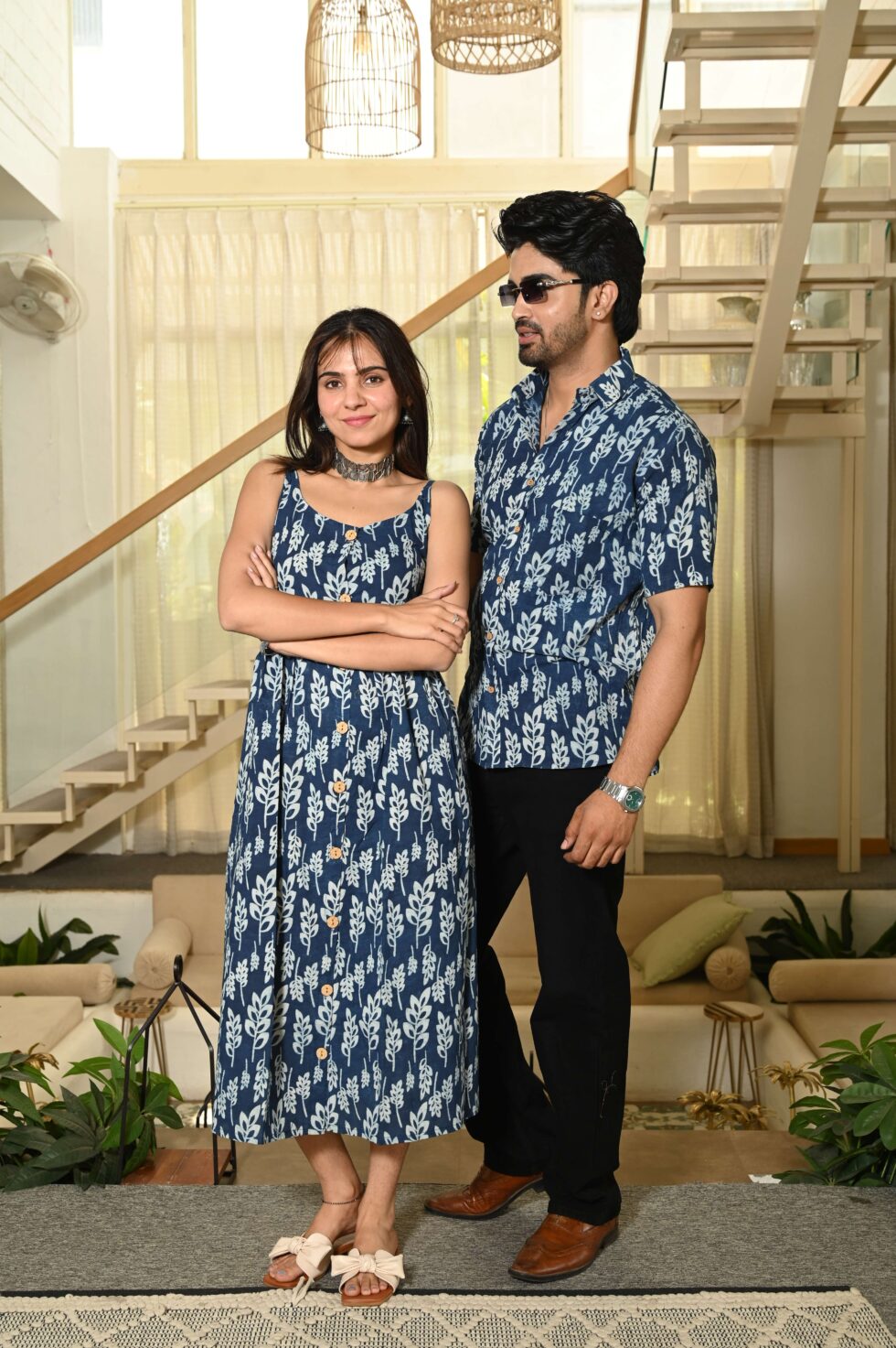 Charming couple matching outfit featuring a floral-inspired cotton dress for women and a coordinated short-sleeve shirt for men. Made from breathable cotton, perfect for vacations, parties, casual outings, and pre-wedding shoots.