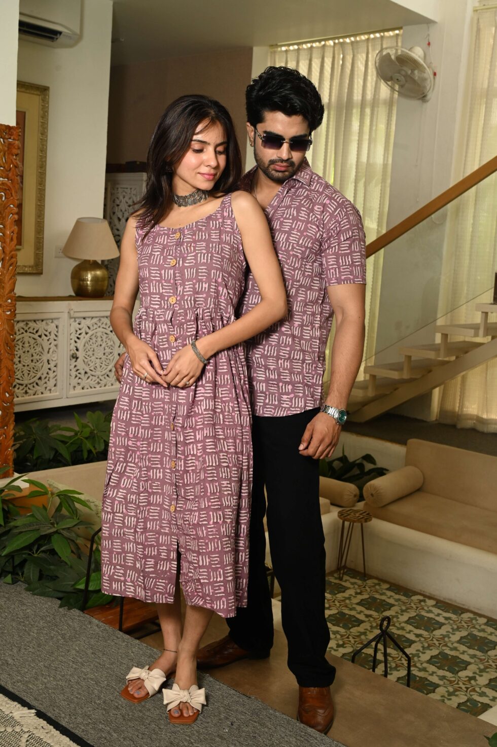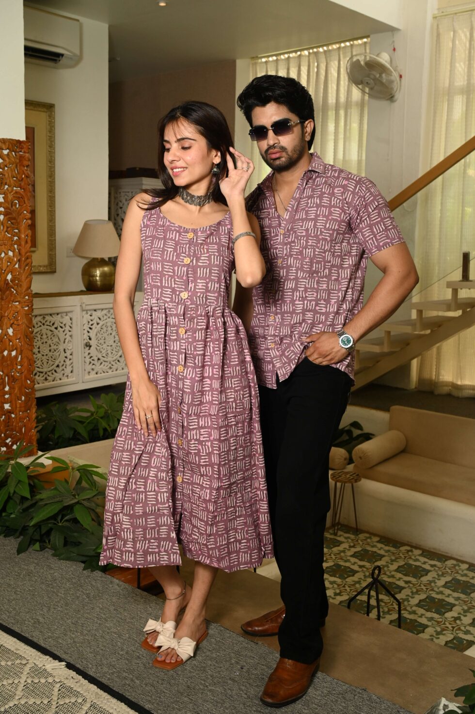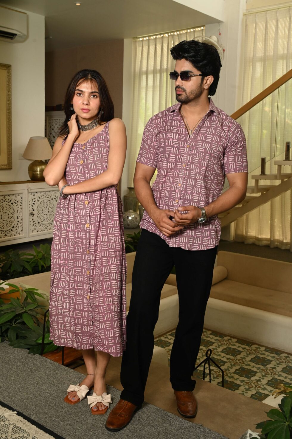 Be the first to review “Couple Matching Outfit ? Lavender Cotton Block Print Midi Dress & Shirt Set, Summer Casual Wear”