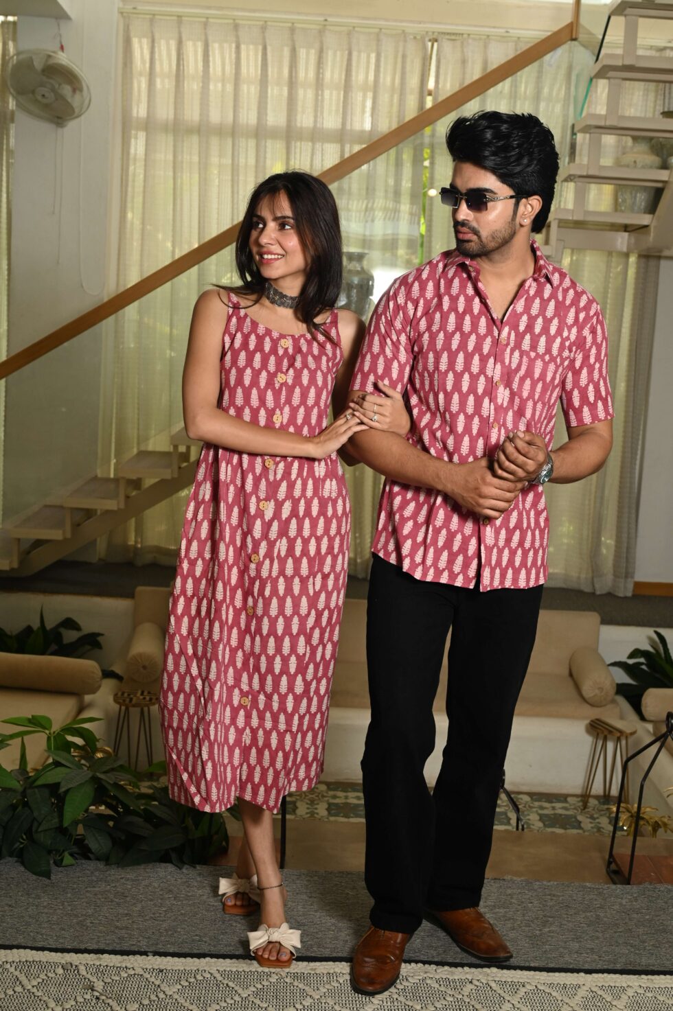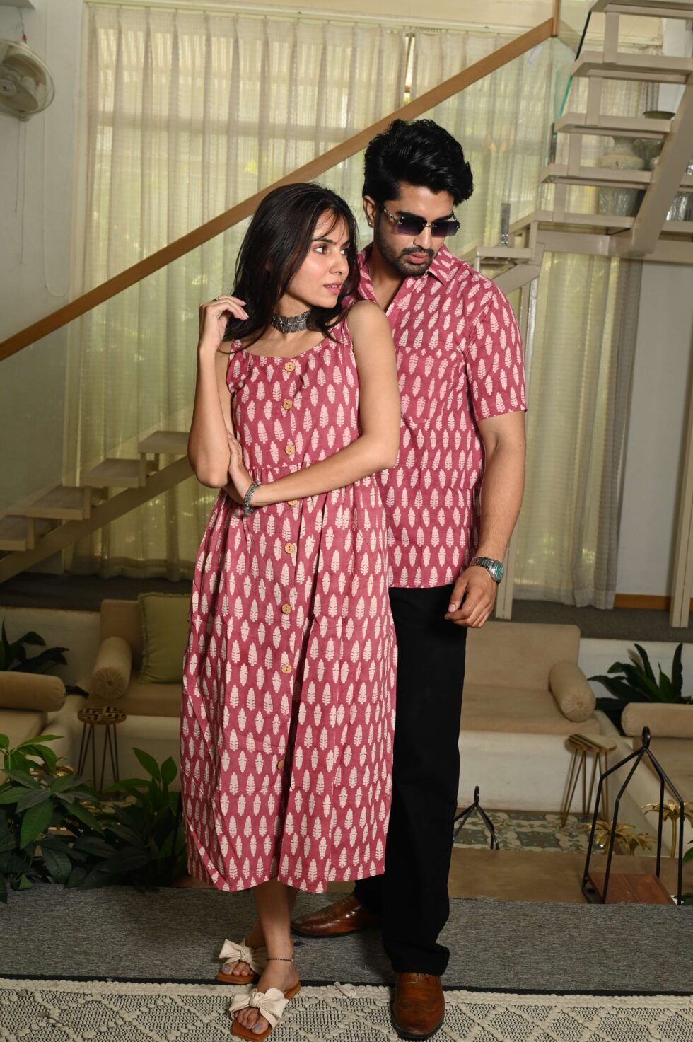 Step out in style with this charming couple matching outfit featuring a printed cotton dress for women and a coordinated short-sleeve shirt for men. Crafted from breathable cotton, this set is perfect for casual outings, vacations, parties, and pre-wedding shoots. The elegant floral-inspired print adds a touch of romance, while the soft fabric ensures all-day comfort. Pair the women?s midi dress with sandals or heels and the men?s shirt with trousers or chinos for a perfectly coordinated couple look.
