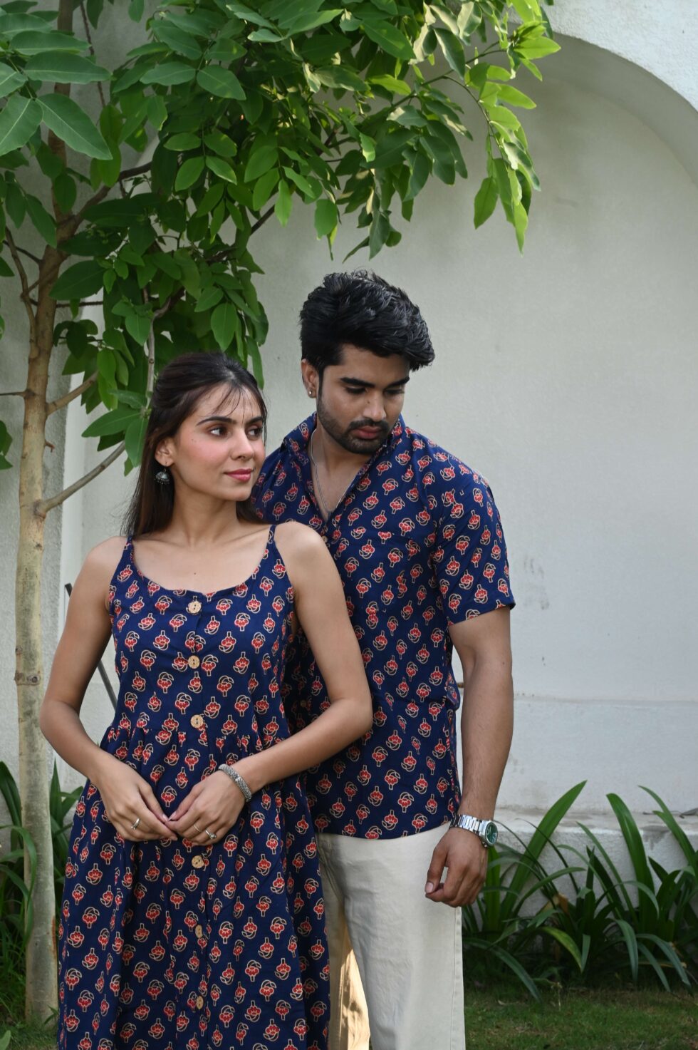 Step out in style with this charming couple matching outfit featuring a printed cotton dress for women and a coordinated short-sleeve shirt for men. Crafted from breathable cotton, this set is perfect for casual outings, vacations, parties, and pre-wedding shoots. The elegant floral-inspired print adds a touch of romance, while the soft fabric ensures all-day comfort. Pair the women?s midi dress with sandals or heels and the men?s shirt with trousers or chinos for a perfectly coordinated couple look.
