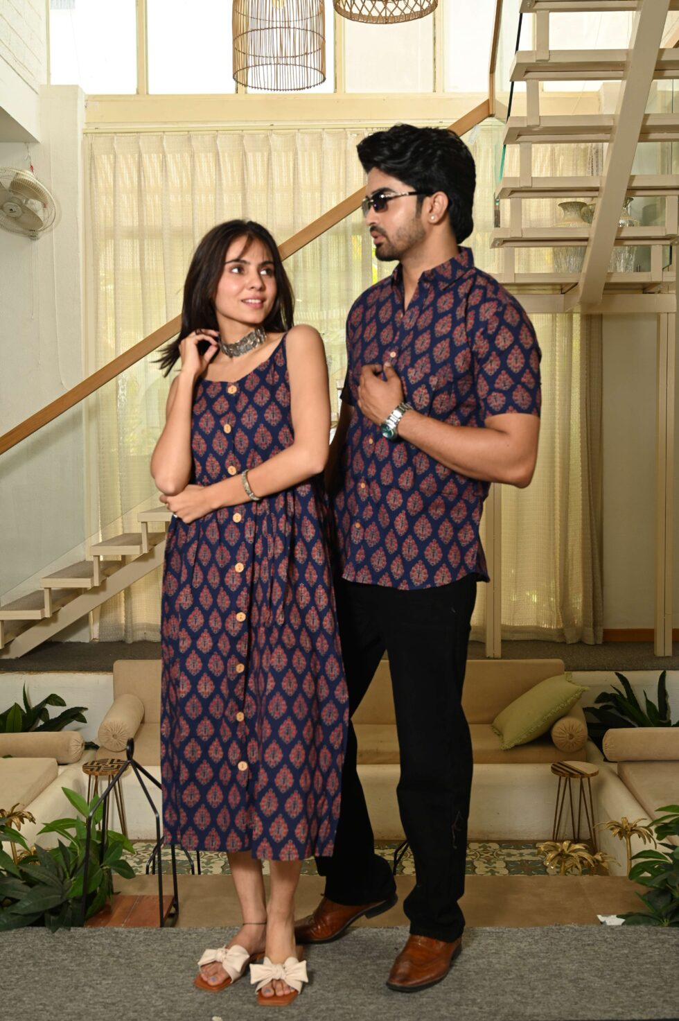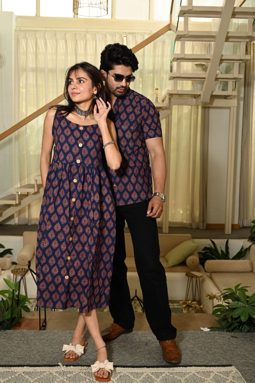 Step out in style with this charming couple matching outfit featuring a printed cotton dress for women and a coordinated short-sleeve shirt for men. Crafted from breathable cotton, this set is perfect for casual outings, vacations, parties, and pre-wedding shoots. The elegant floral-inspired print adds a touch of romance, while the soft fabric ensures all-day comfort. Pair the women?s midi dress with sandals or heels and the men?s shirt with trousers or chinos for a perfectly coordinated couple look.