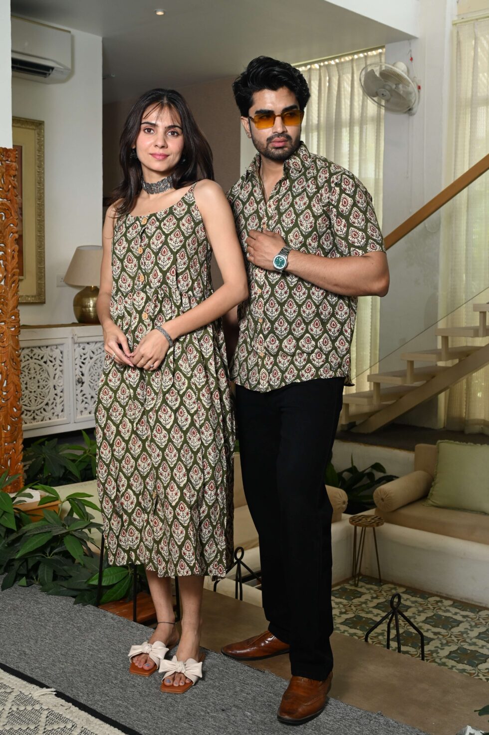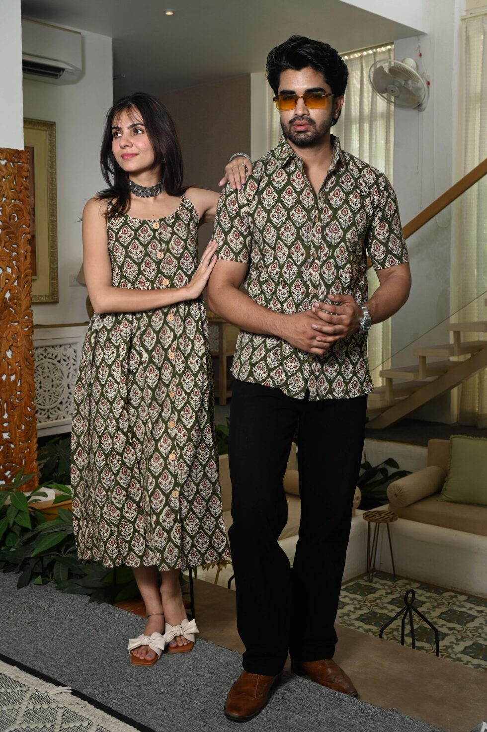 Step out in style with this charming couple matching outfit featuring a printed cotton dress for women and a coordinated short-sleeve shirt for men. Crafted from breathable cotton, this set is perfect for casual outings, vacations, parties, and pre-wedding shoots. The elegant floral-inspired print adds a touch of romance, while the soft fabric ensures all-day comfort. Pair the women?s midi dress with sandals or heels and the men?s shirt with trousers or chinos for a perfectly coordinated couple look.