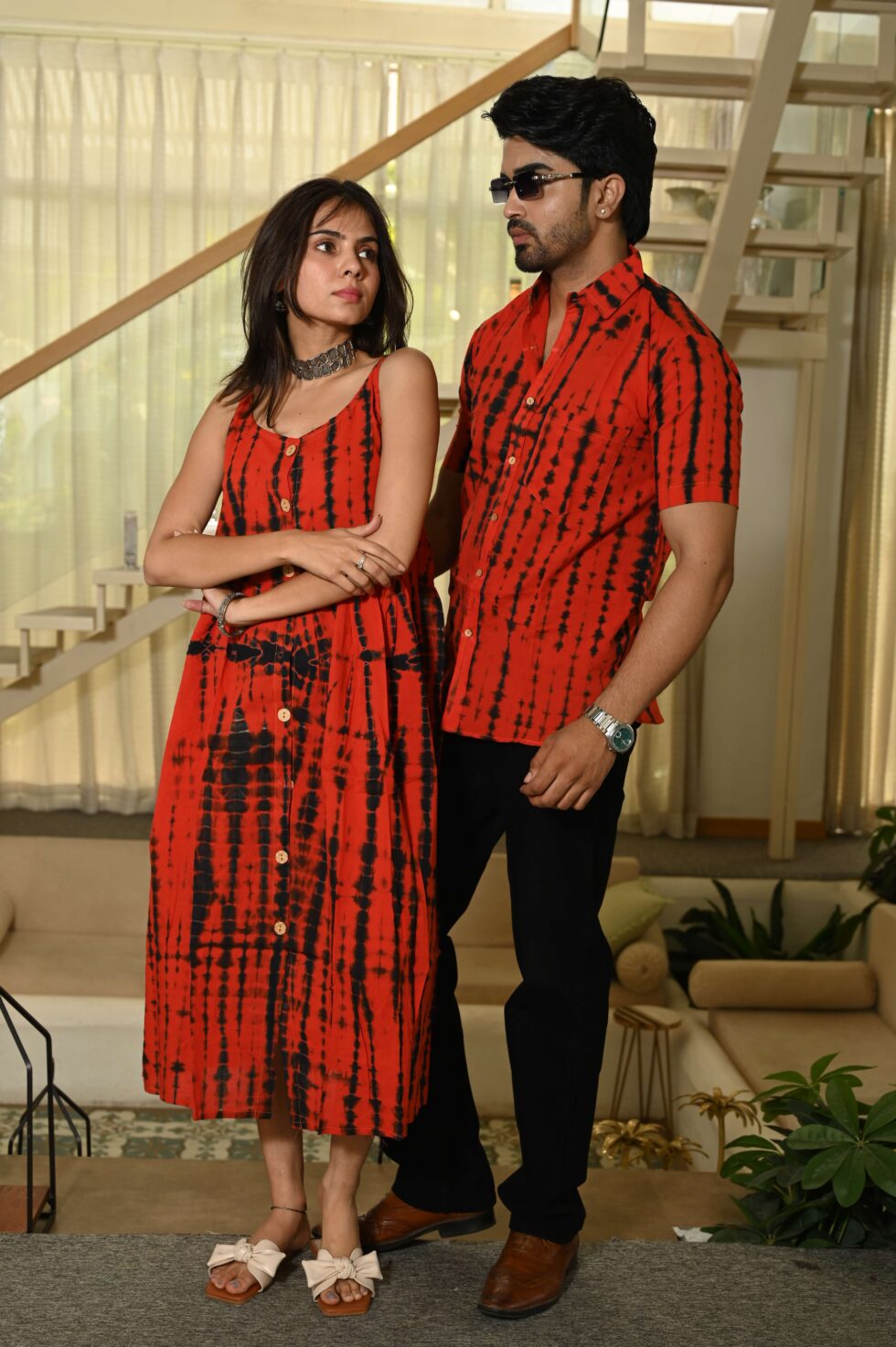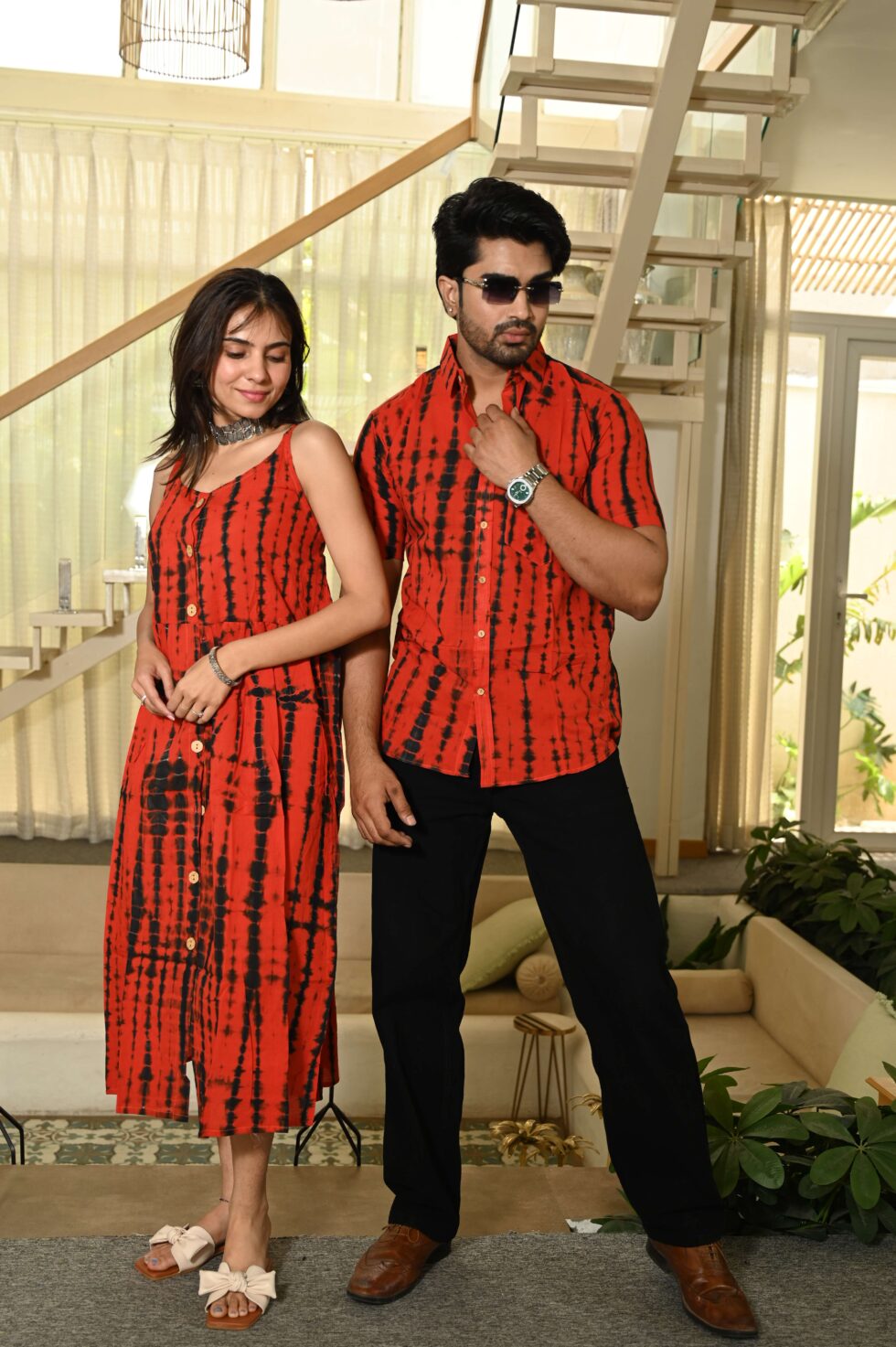 Step out in style with this charming couple matching outfit featuring a printed cotton dress for women and a coordinated short-sleeve shirt for men. Crafted from breathable cotton, this set is perfect for casual outings, vacations, parties, and pre-wedding shoots. The elegant floral-inspired print adds a touch of romance, while the soft fabric ensures all-day comfort. Pair the women?s midi dress with sandals or heels and the men?s shirt with trousers or chinos for a perfectly coordinated couple look.
