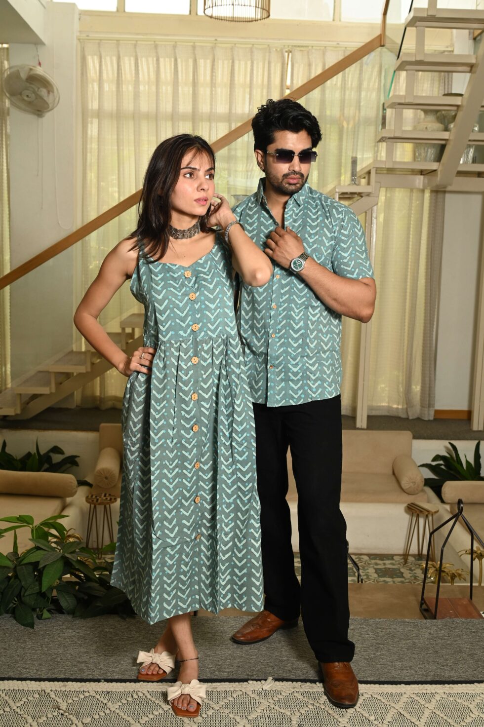 Step out in style with this charming couple matching outfit featuring a printed cotton dress for women and a coordinated short-sleeve shirt for men. Crafted from breathable cotton, this set is perfect for casual outings, vacations, parties, and pre-wedding shoots. The elegant floral-inspired print adds a touch of romance, while the soft fabric ensures all-day comfort. Pair the women?s midi dress with sandals or heels and the men?s shirt with trousers or chinos for a perfectly coordinated couple look.