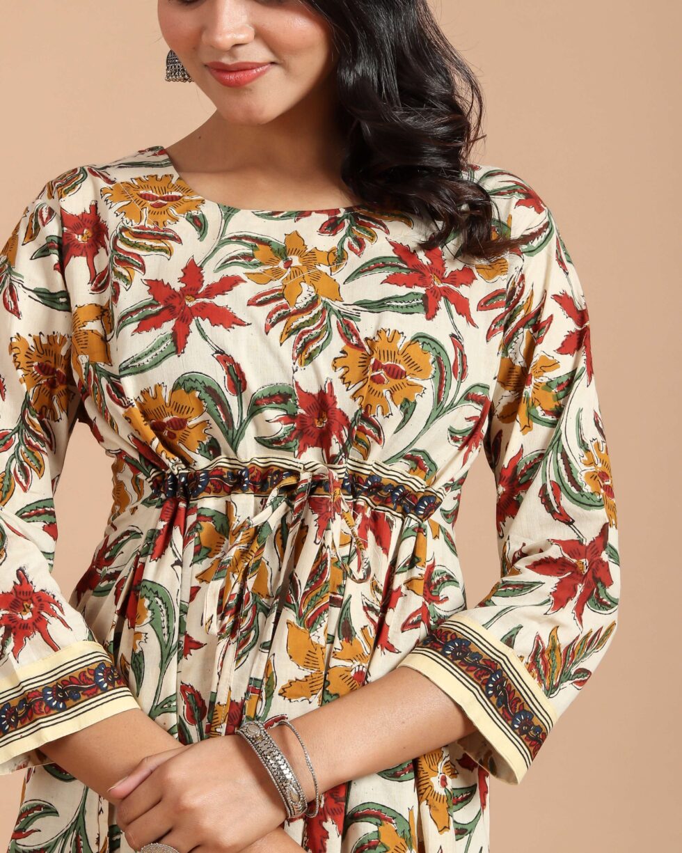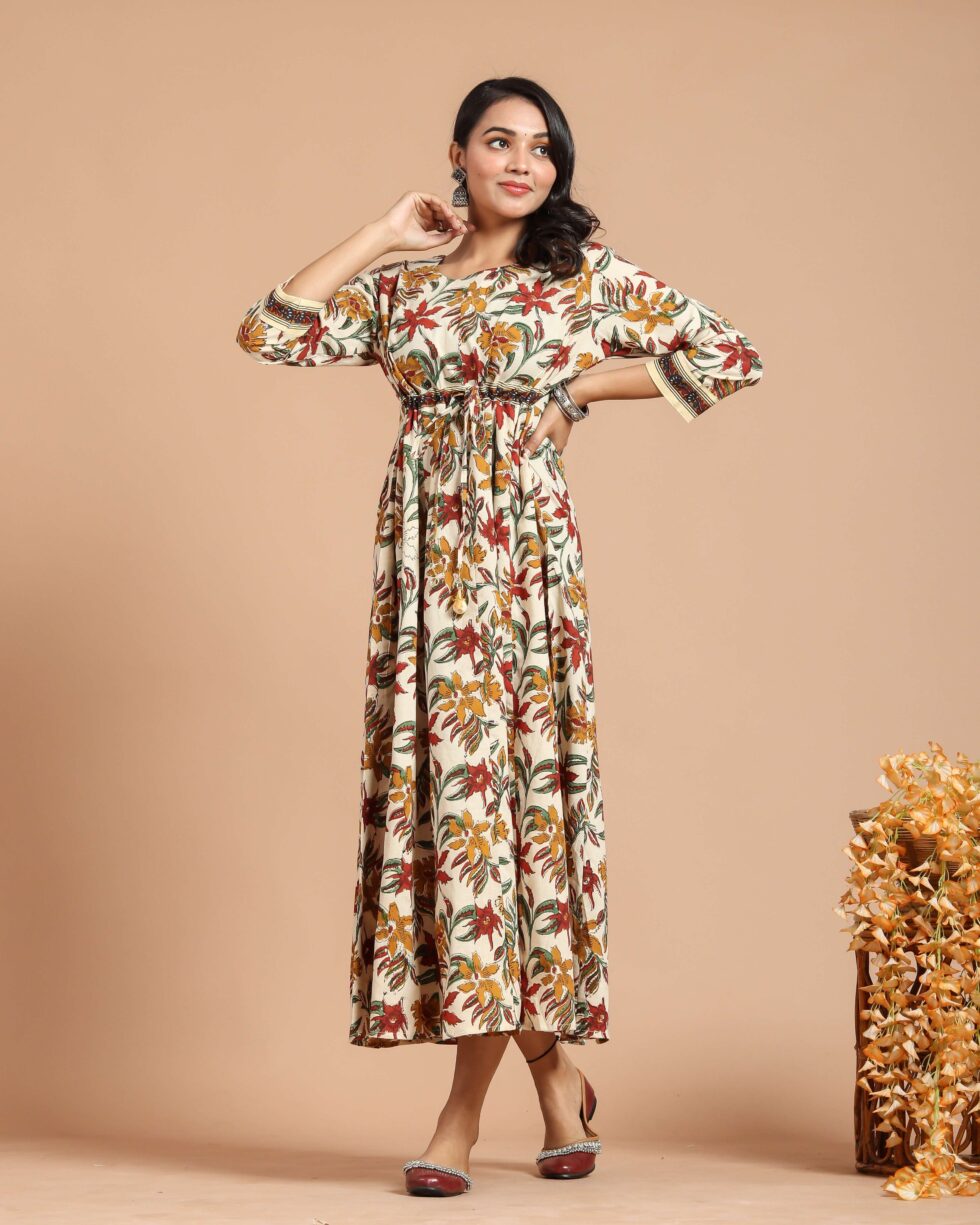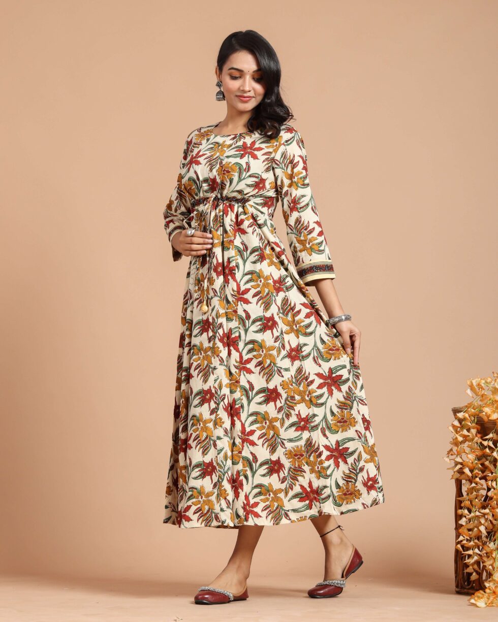 Cream Floral Printed Maxi Dress with Drawstring Waist & 3/4th Sleeves