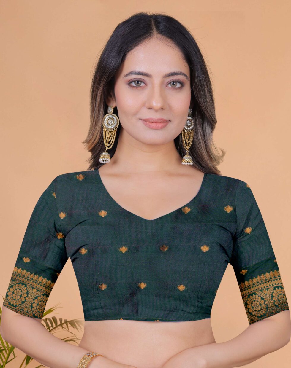 Elevate your festive wardrobe with the Crimson Majesty Banarasi Silk Saree in vibrant cherry red and bottle green, featuring intricate floral zari motifs, a grand green-gold border, and a regal woven pallu. Comes with a matching unstitched blouse, perfect for weddings, celebrations, and traditional ceremonies.