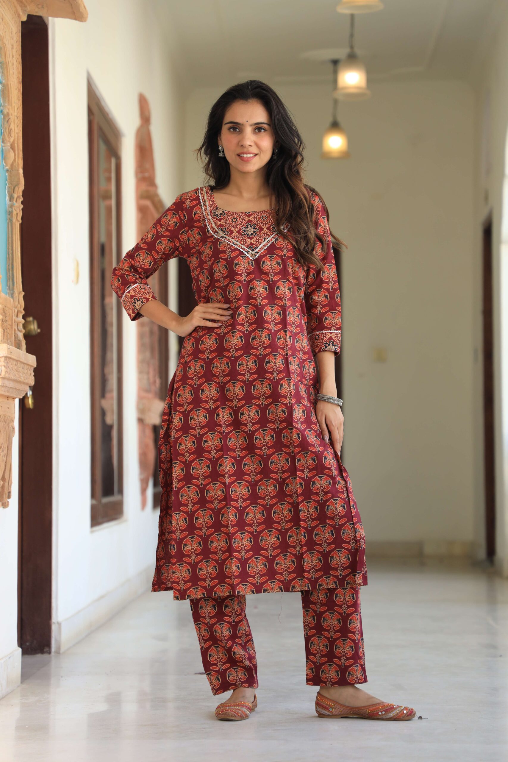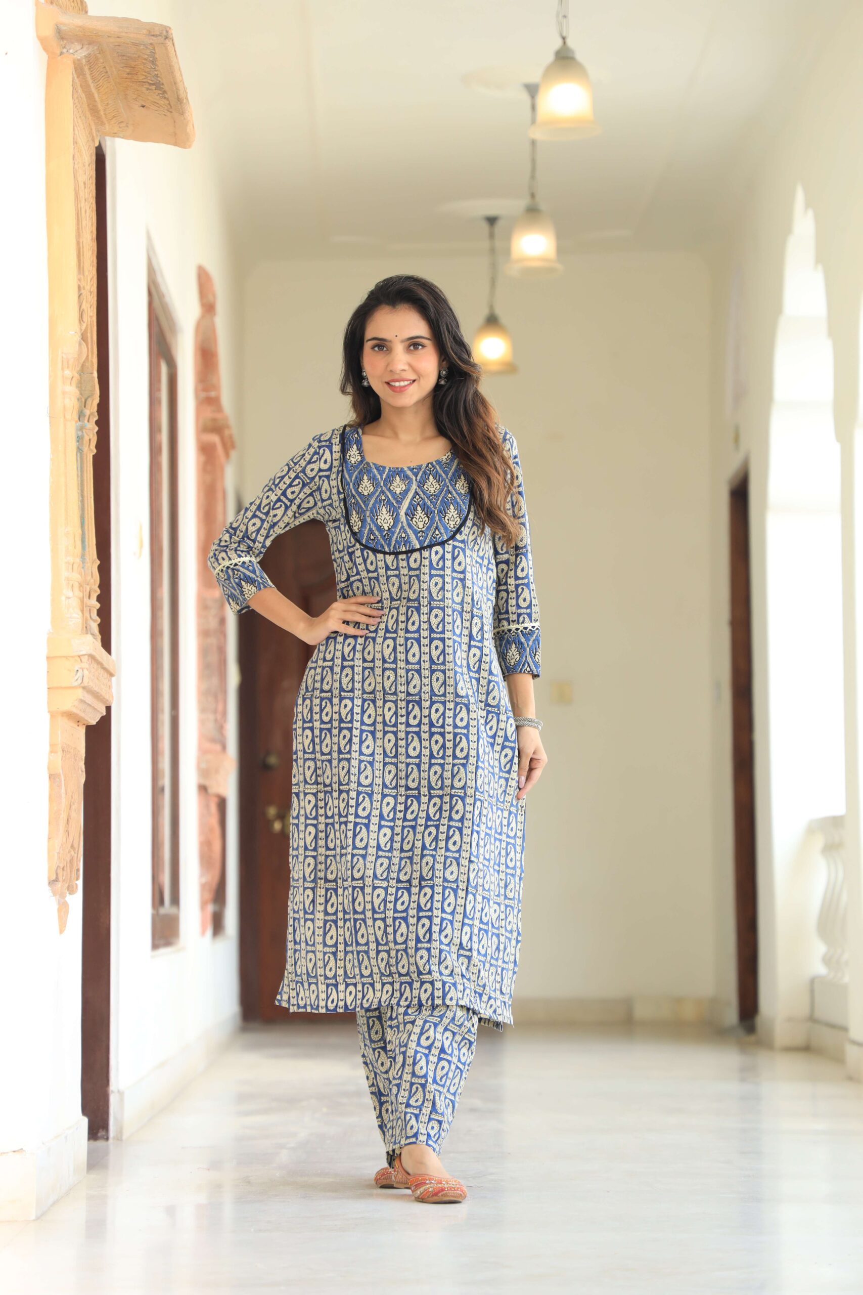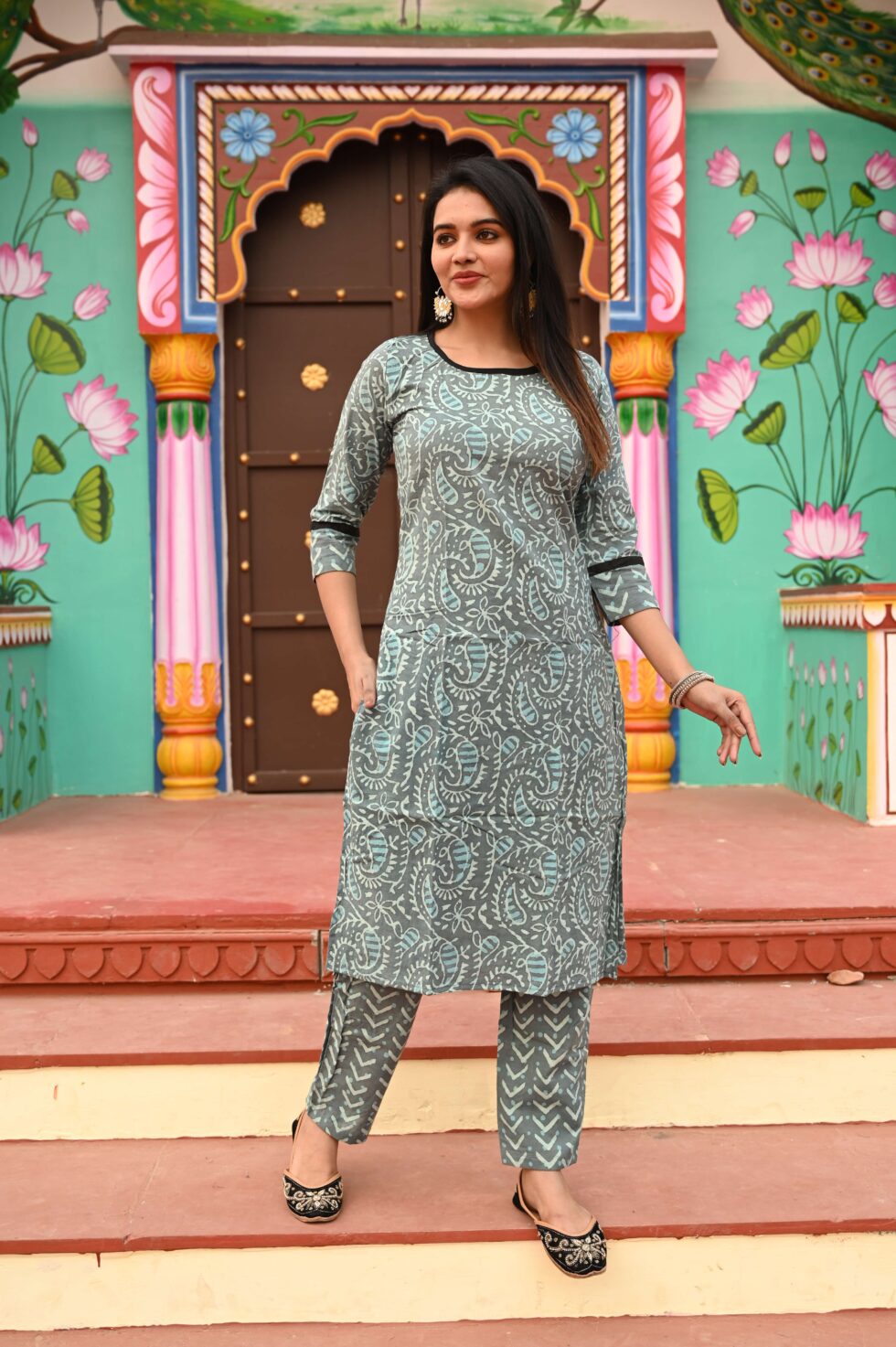 dusty teal green cotton kurta set, beautifully adorned with hand-block inspired white floral motifs. The kurta is styled with a scoop neckline enhanced with black piping and 3/4th sleeves for a refined look. The straight-fit contrast printed pants add a stylish twist, making the set perfect for both casual and semi-formal occasions. Made from lightweight, breathable cotton, this set keeps you cool and comfortable throughout the day. Whether it?s for office wear, casual outings, festive gatherings, or daily wear, this kurta set is an effortless choice.