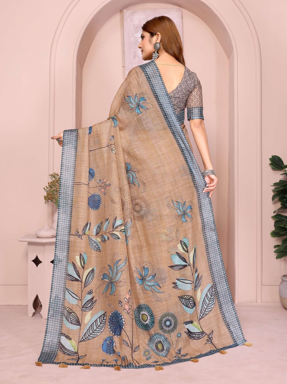 Add a touch of freshness with this beige linen cotton saree, adorned with delicate blue floral motifs and a check-patterned blue border with mustard tassels ? perfect for festive, casual, or office wear.