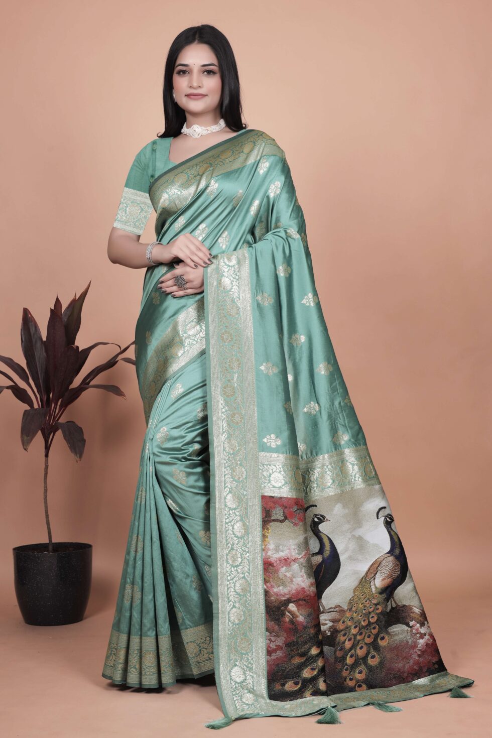 Step into elegance with this sea green silk saree, featuring gold zari floral weaving and a majestic peacock motif pallu. Perfect for weddings, parties, and festive occasions. Includes matching blouse piece.