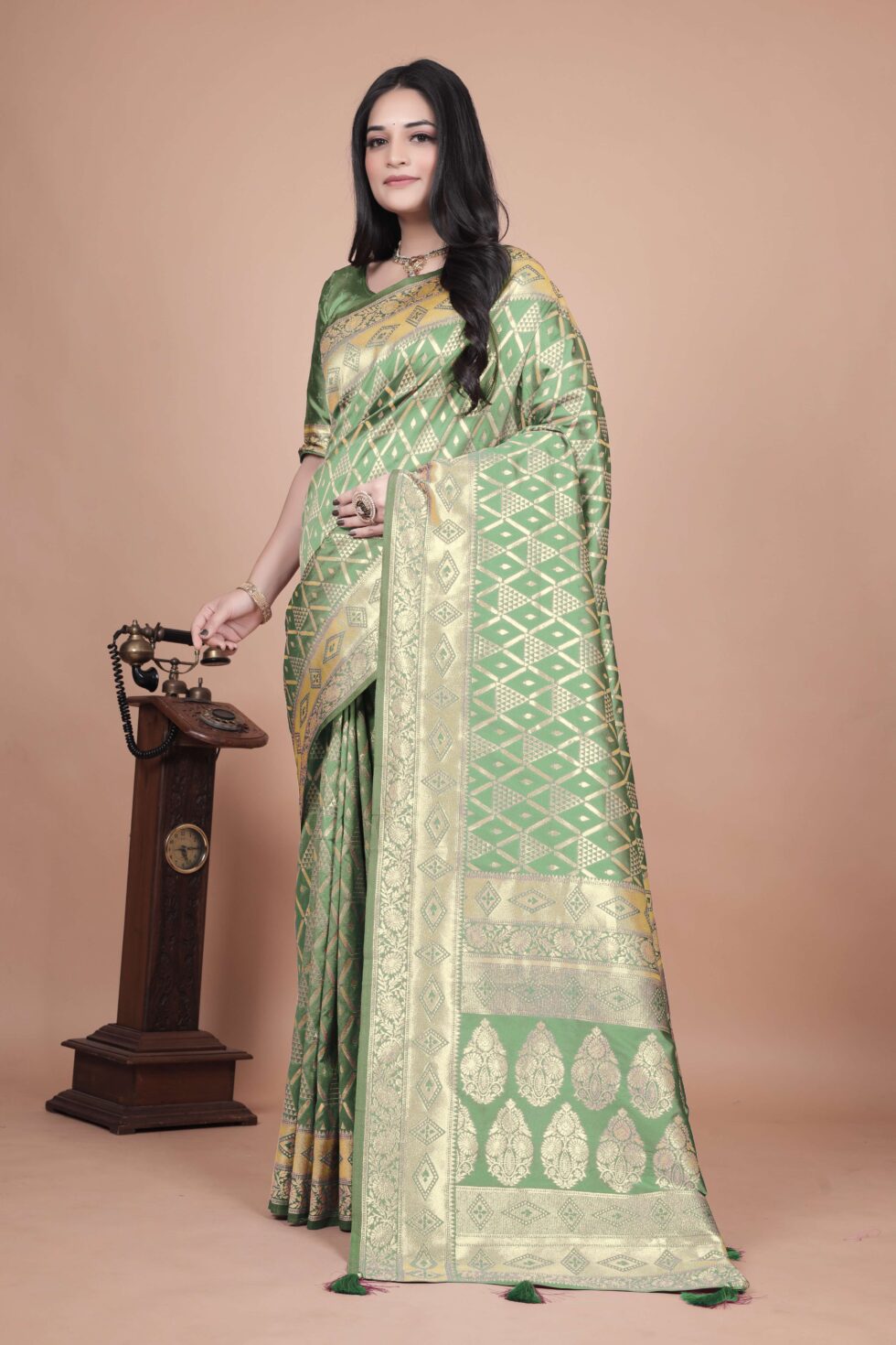 Make a statement with this emerald green Banarasi silk saree, featuring silver zari geometric motifs, floral pallu, and ornate borders. Ideal for weddings, festivals, and traditional celebrations.