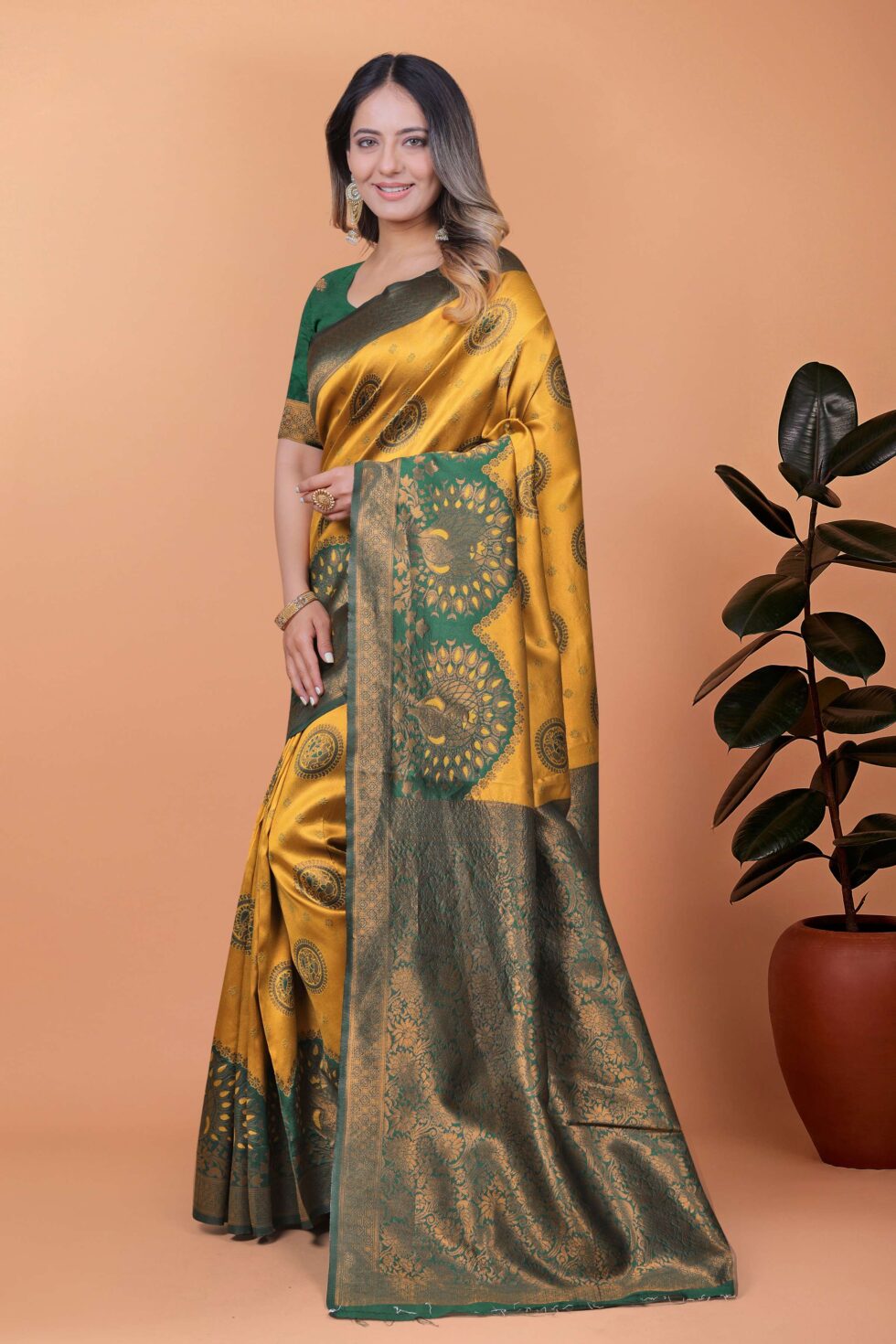 Golden Glow Banarasi Silk Saree with Peacock Zari Motifs & Deep Green Pallu | Wedding, Festive, Traditional Ethnic Wear