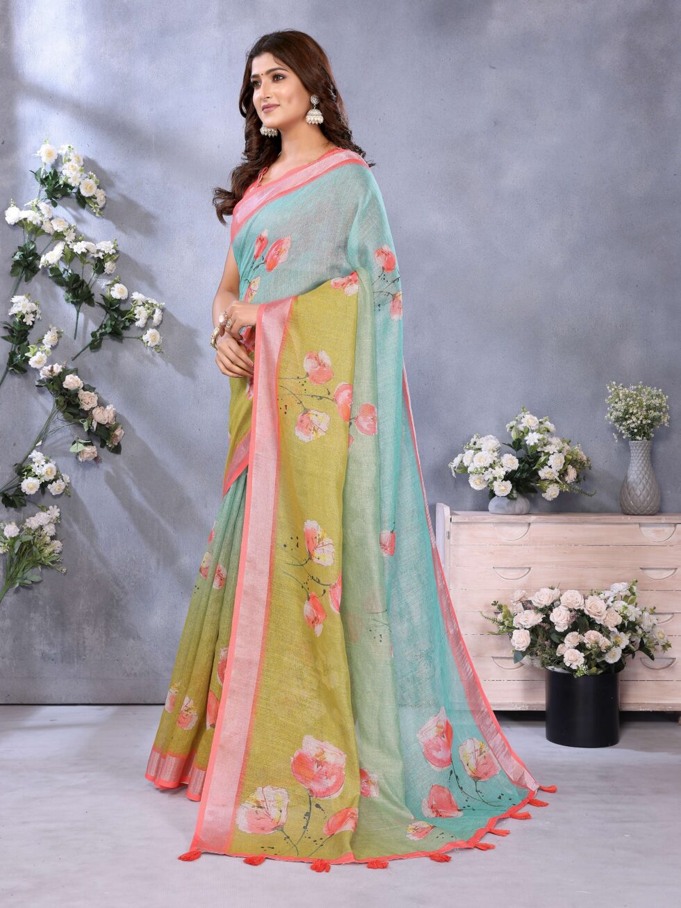 This stunning green and aqua linen shimmer saree features a delicate floral print and a vibrant peach-pink border. Lightweight and elegant, it’s the perfect choice for a fresh and graceful look at any festive or casual occasion.