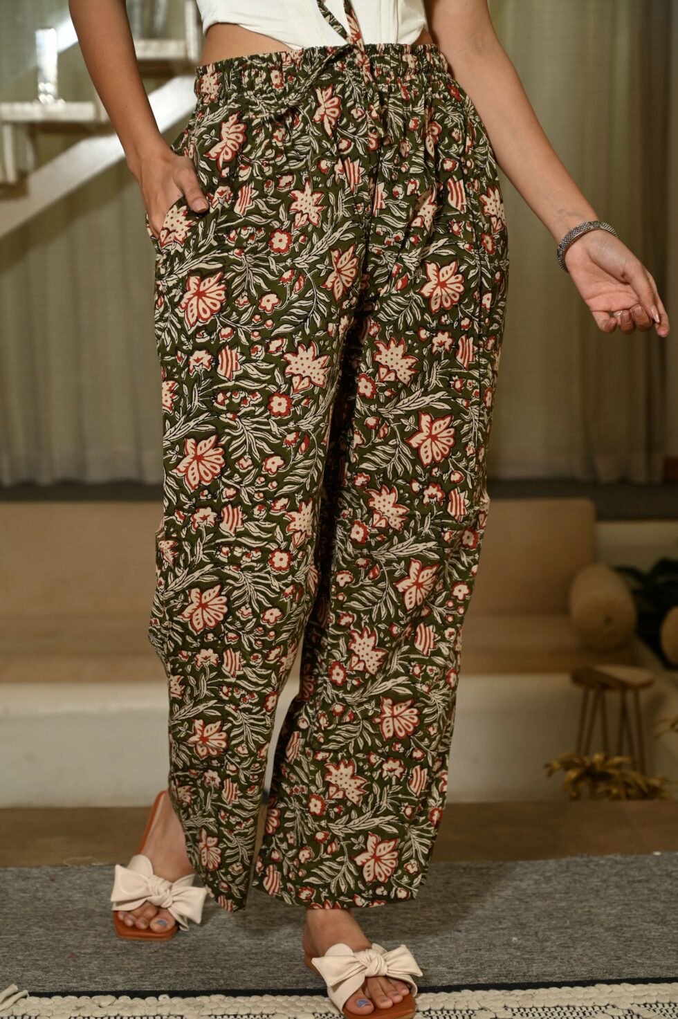 Step into comfort and style with this green floral cotton co-ord set featuring a chic peplum top and matching straight pants. Perfect for casual outings, home wear, or festive gatherings, this breathable outfit combines elegance with ease.