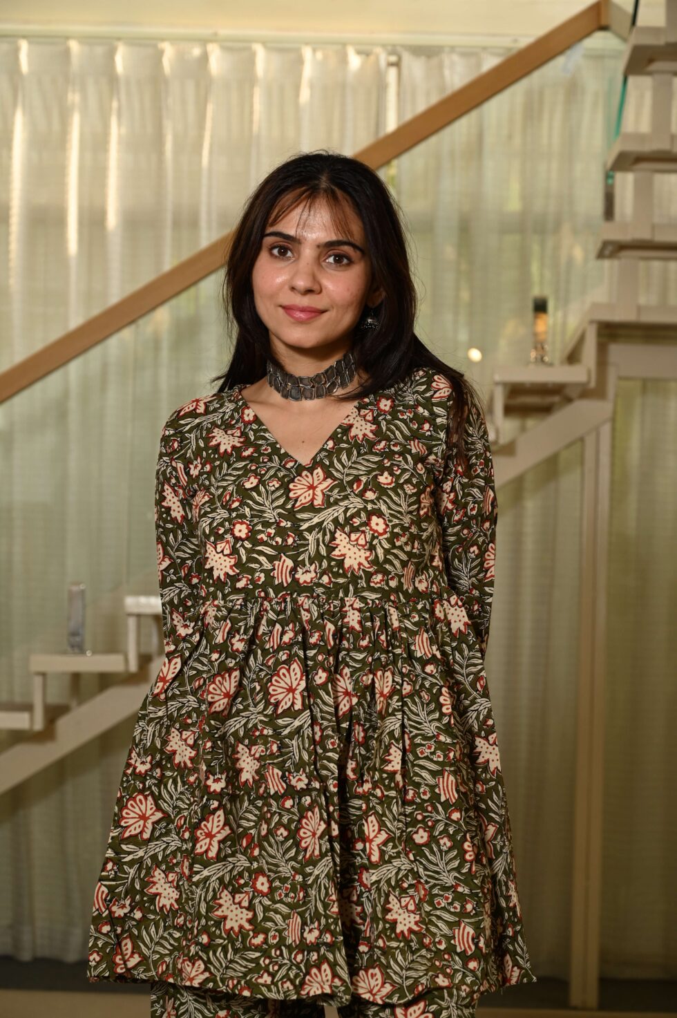 Green floral print cotton co-ord set for women, designed with a playful peplum-style kurta and coordinating straight-fit pants. Crafted from soft and breathable cotton, this set ensures all-day comfort while keeping you effortlessly stylish. The vibrant floral motifs add a refreshing touch, making it ideal for brunches, festive occasions, or relaxed home gatherings. Pair it with ethnic jewelry and flats for a traditional vibe, or style it with minimal accessories for a modern casual look.
