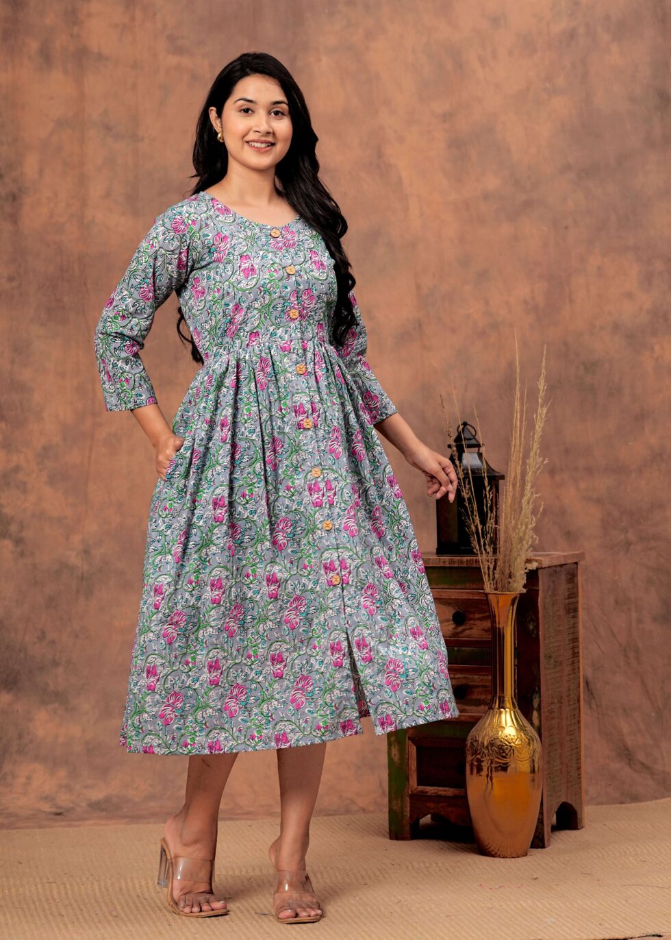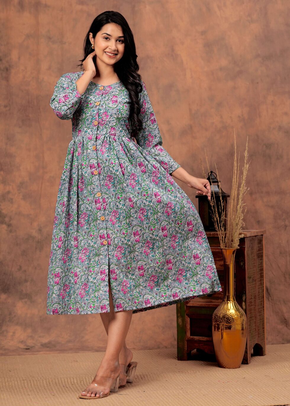 Grey & Pink Floral Printed Cotton Midi Dress with Button-Down Front