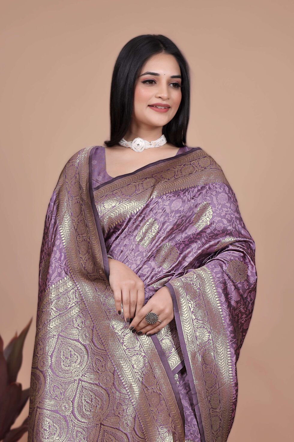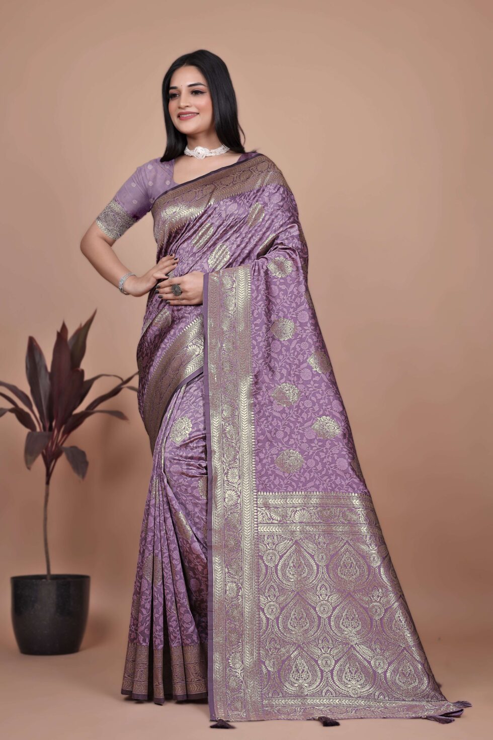 Lavender Banarasi Silk Saree with Gold Zari Butti | Majestic Pallu & Ornate Border | Wedding, Festival & Traditional Wear