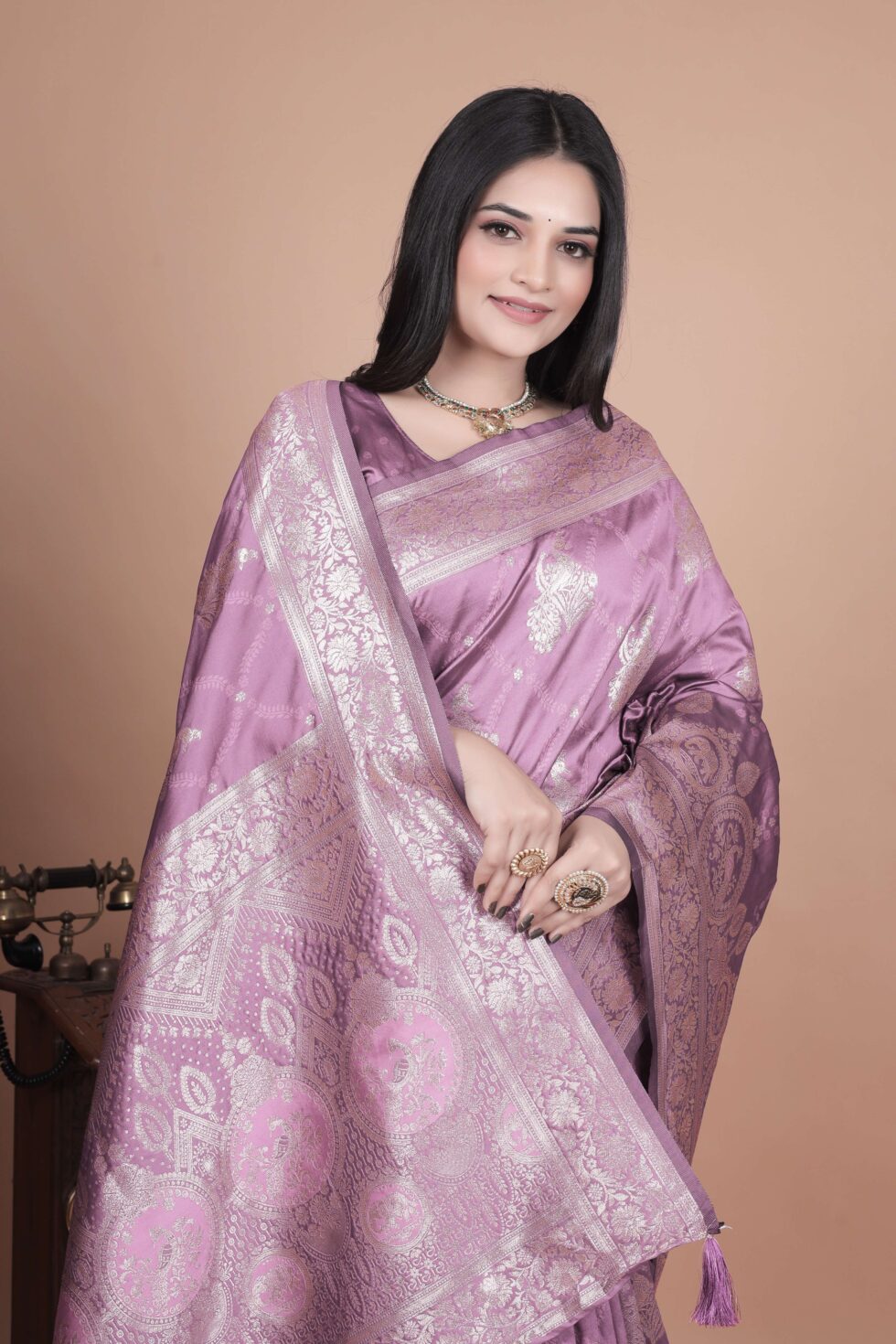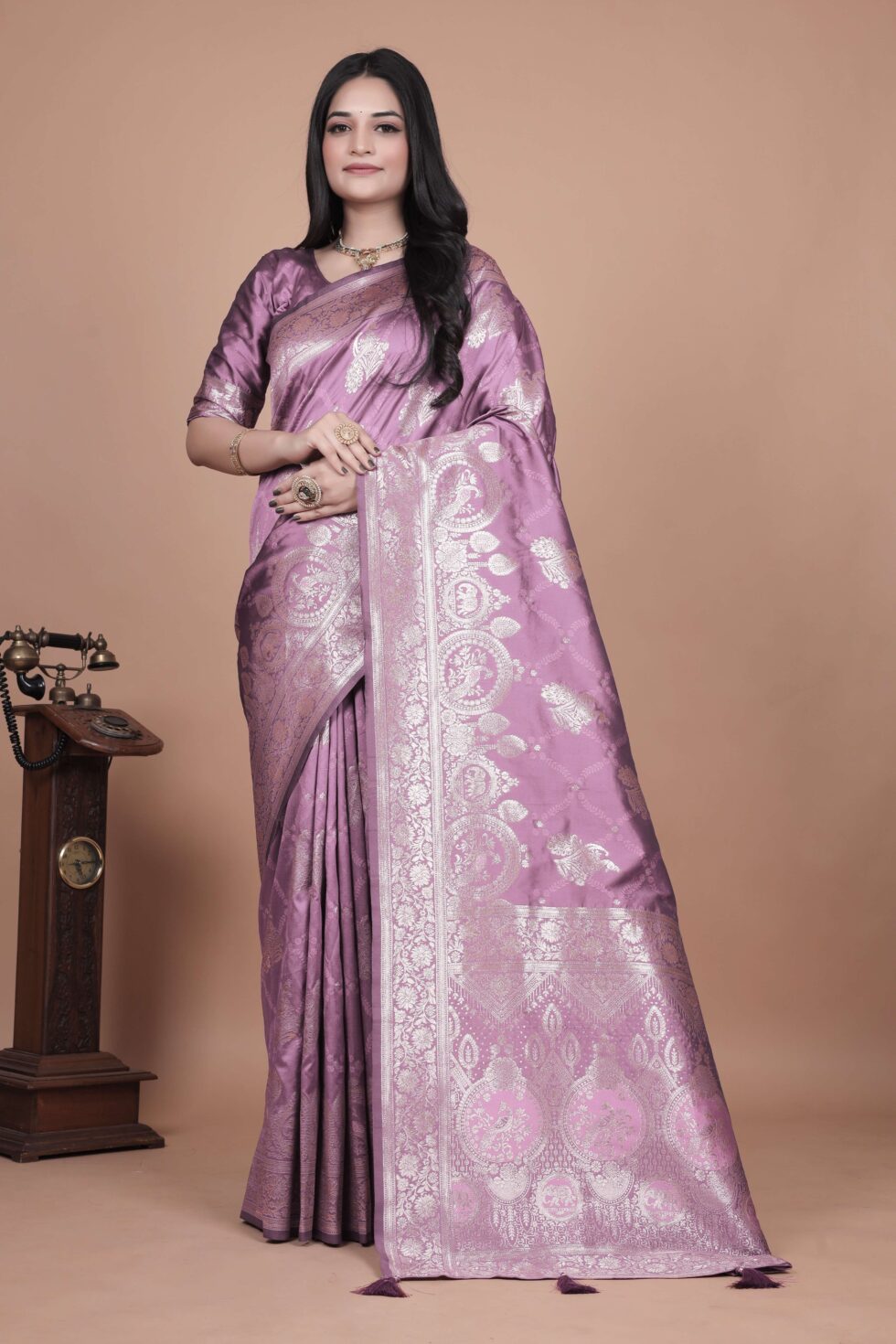 Lavender Banarasi Silk Saree with Silver Zari | Floral & Paisley Motifs | Wedding, Festive & Traditional Wear