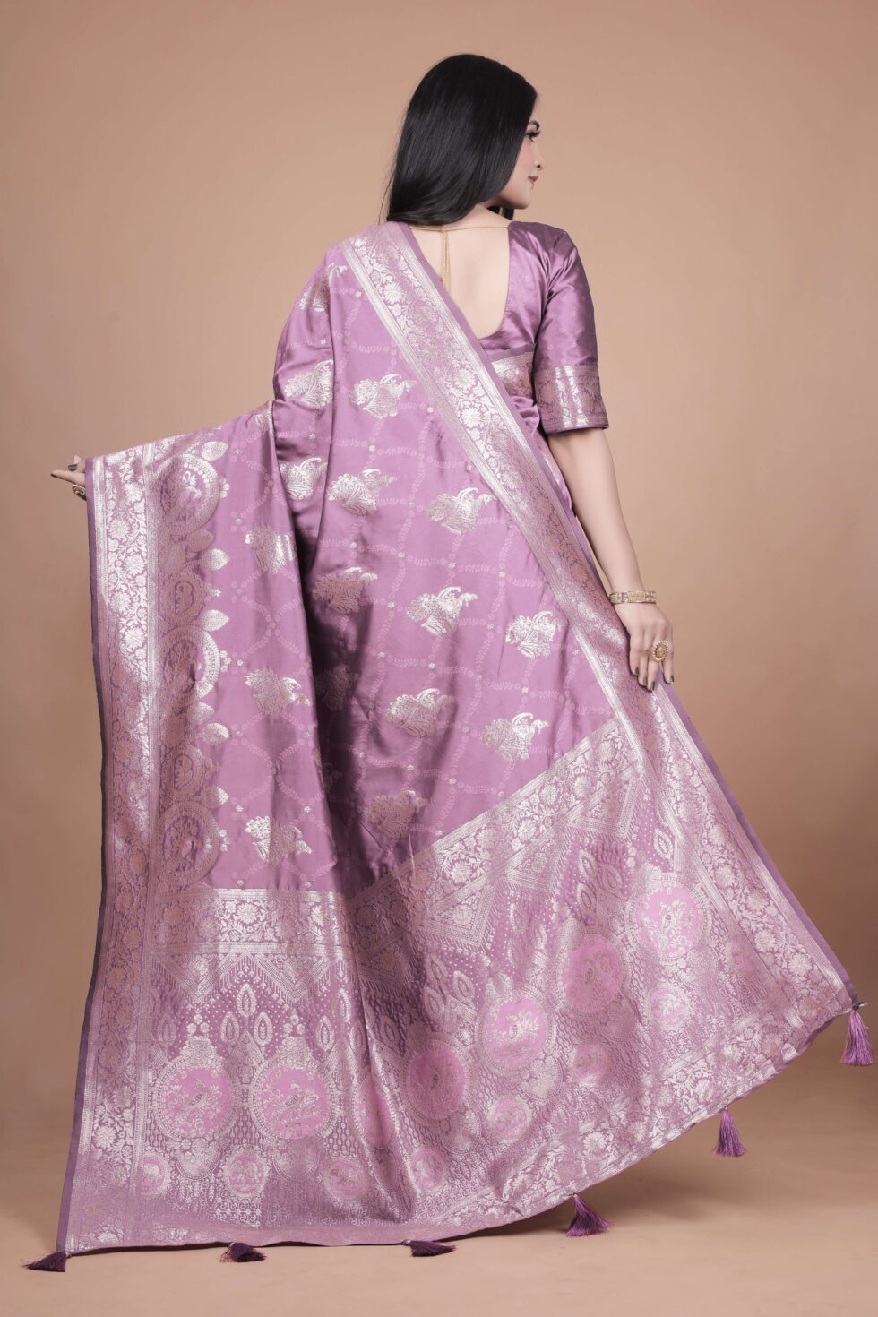 Drape elegance with this lavender Banarasi silk saree, featuring intricate silver zari floral and paisley motifs, richly woven pallu, and ornate border. Perfect for weddings, receptions, festive occasions, and cultural ceremonies, with matching blouse piece included.