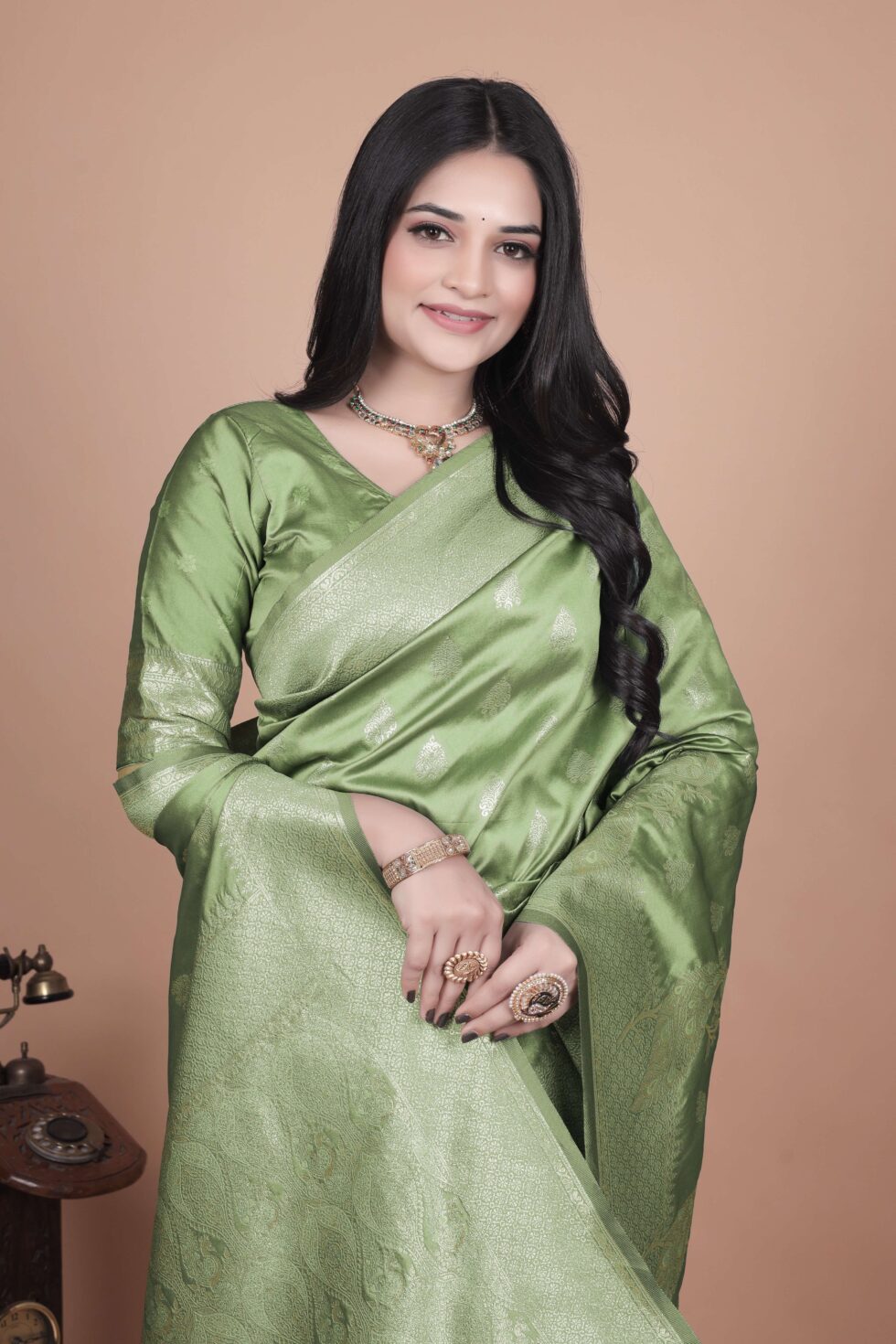 Radiate elegance with this lime green Banarasi silk saree, adorned with golden zari peacock and paisley motifs, rich floral pallu, and ornate borders. Ideal for weddings, festivals, parties, and traditional occasions, with matching blouse piece included.