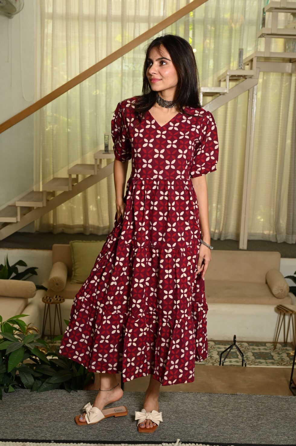Maroon Printed Cotton Anarkali Maxi Dress with Puff Sleeves ? Elegant Casual Wear