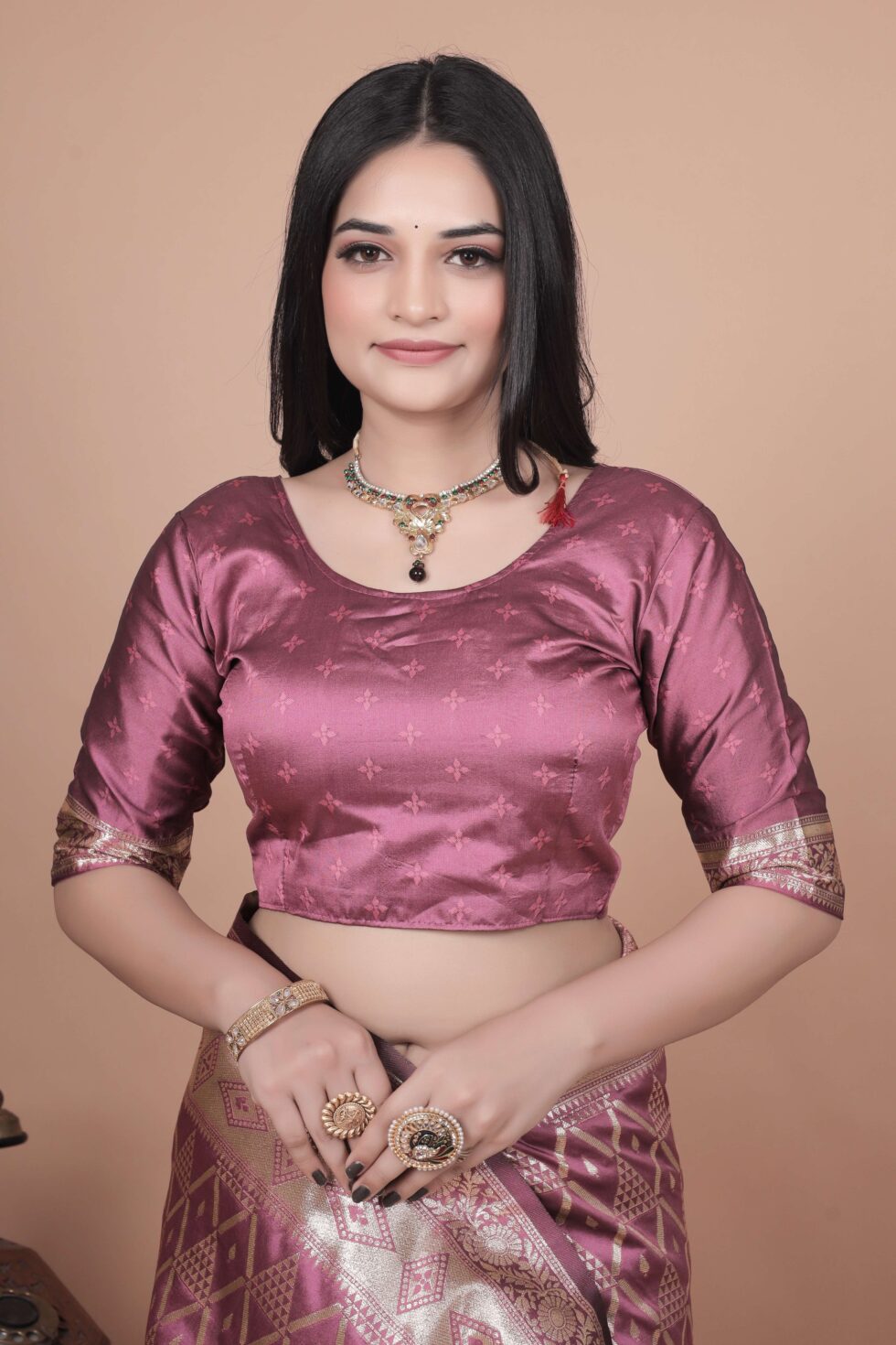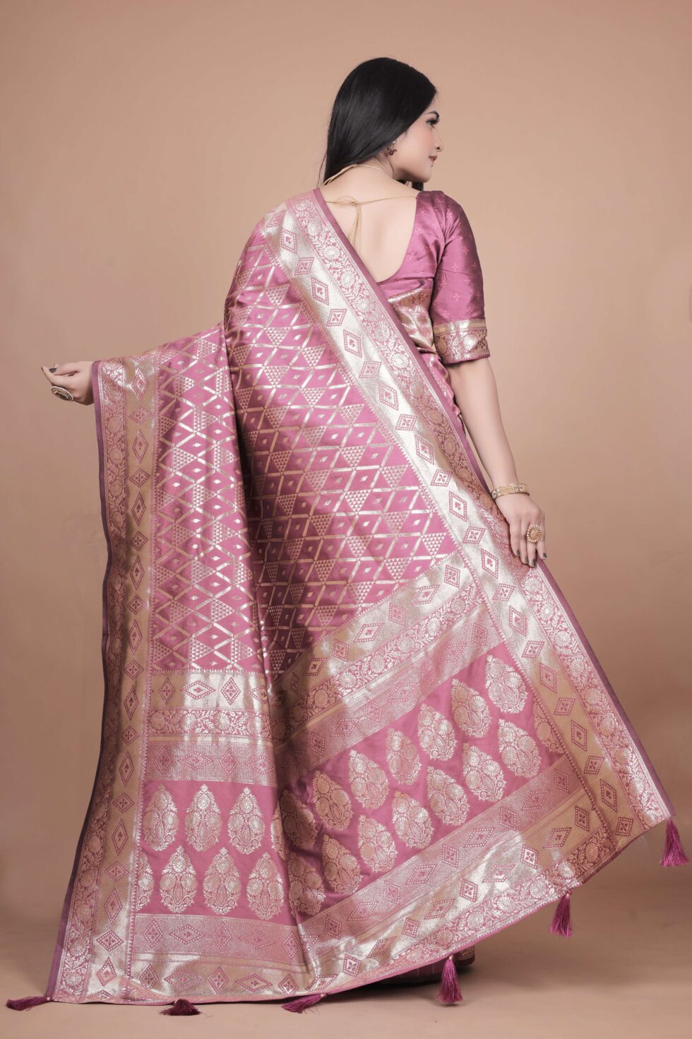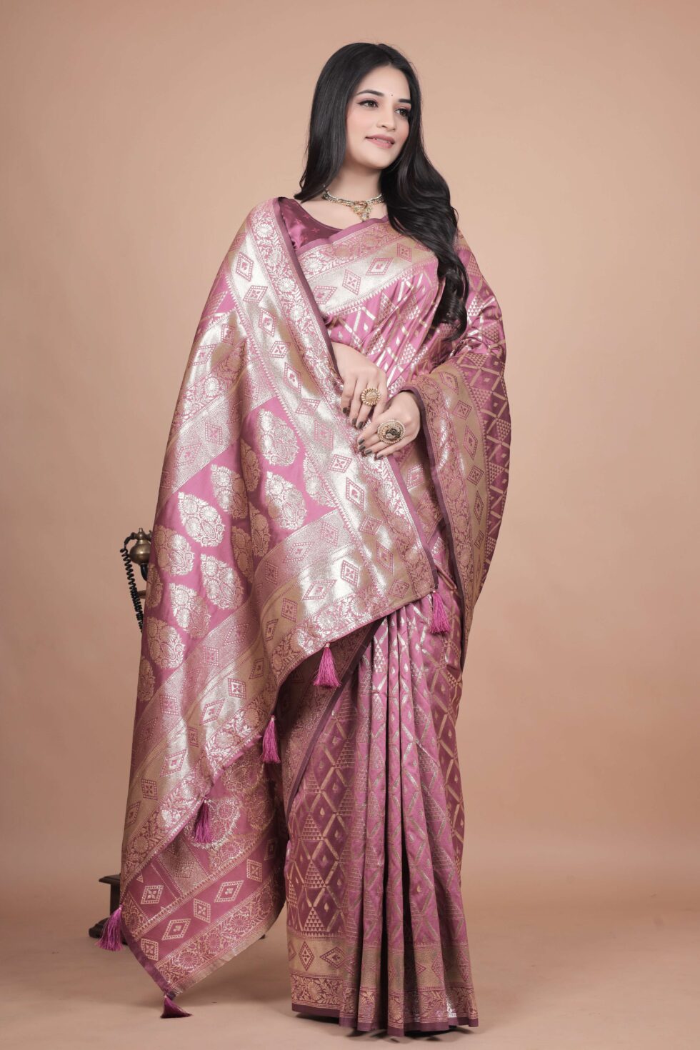 Turn heads with this mauve Banarasi silk saree featuring silver zari geometric patterns, floral pallu & ornate border. Perfect for weddings, receptions, and festive occasions.