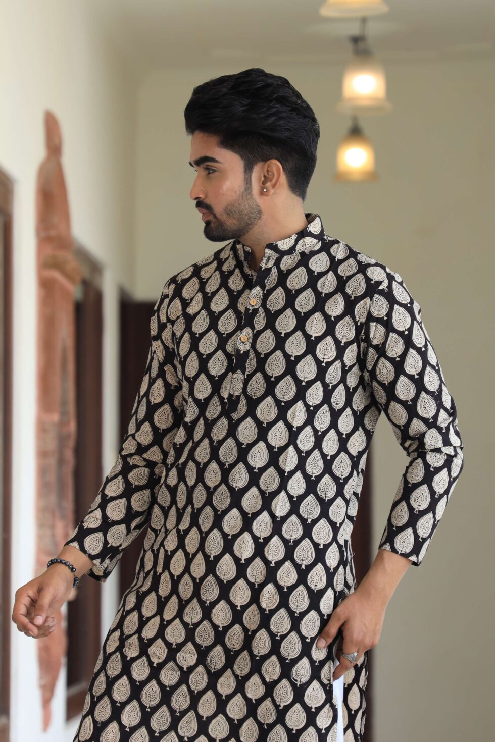 stylish Black Leaf printed cotton kurta set for men, paired Black Leaf with classic white pajama pants. Designed with a comfortable fit and elegant detailing, this kurta is perfect for festivals, weddings, parties, pooja ceremonies, and cultural celebrations. The breathable cotton fabric ensures comfort, while the subtle printed motifs add a touch of sophistication. Pair it with leather sandals or juttis to complete your traditional look.