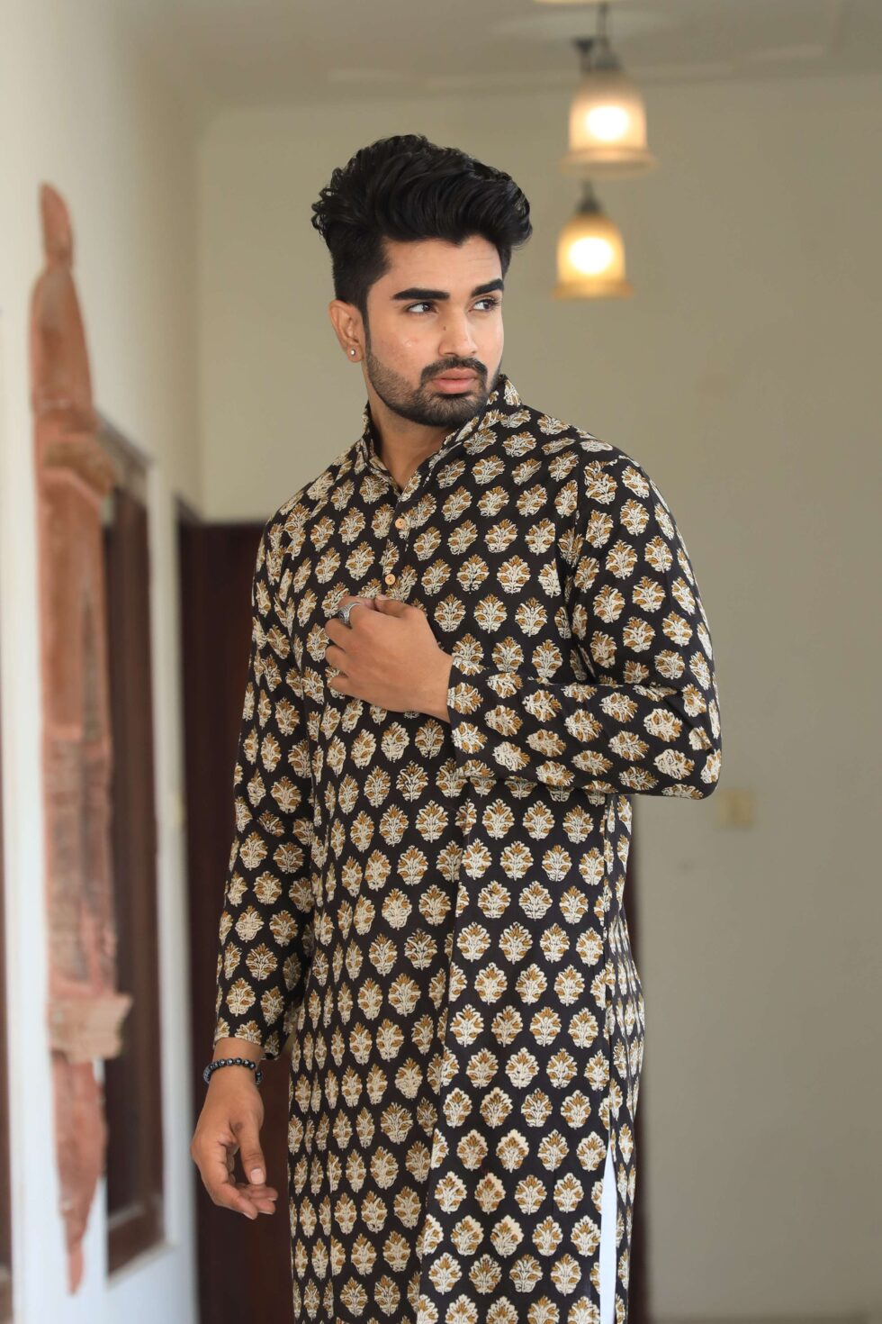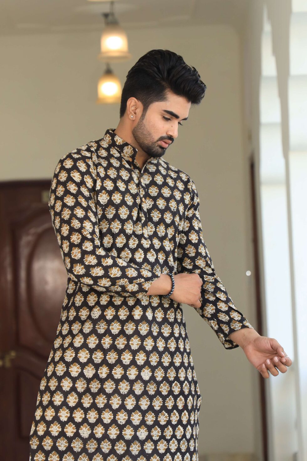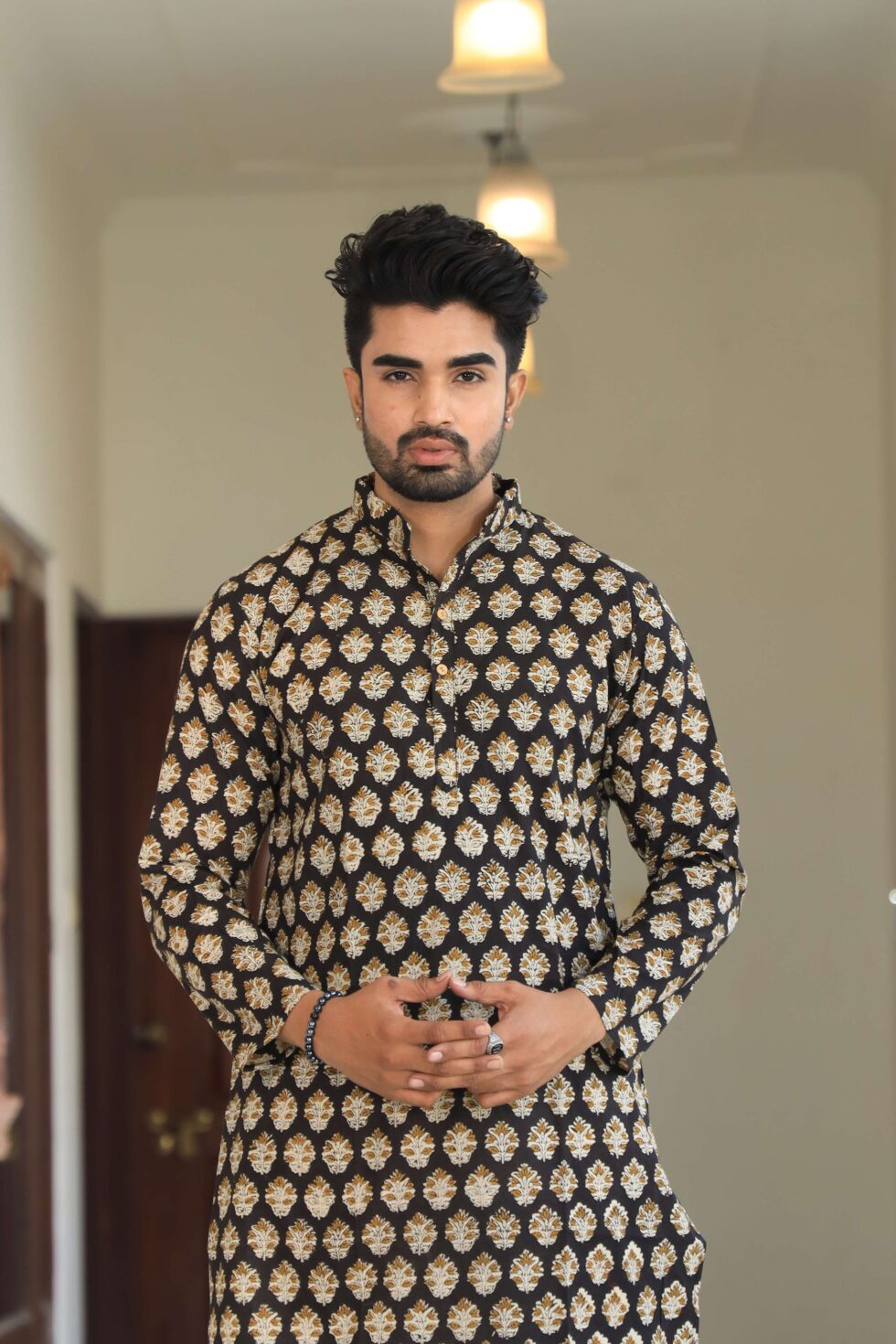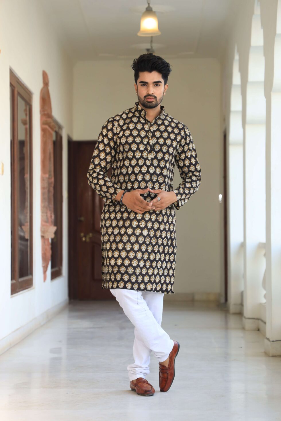 stylish Black printed cotton kurta set for men, paired Black with classic white pajama pants. Designed with a comfortable fit and elegant detailing, this kurta is perfect for festivals, weddings, parties, pooja ceremonies, and cultural celebrations. The breathable cotton fabric ensures comfort, while the subtle printed motifs add a touch of sophistication. Pair it with leather sandals or juttis to complete your traditional look.